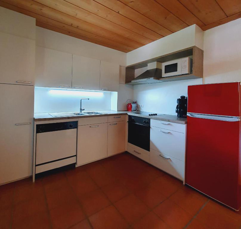 2 ložnice s manželskou postelí, obývací pokoj s kuchyňským koutem a rozkládacím gaučem pro 2 osoby, sociální zařízení s vanou, terasa