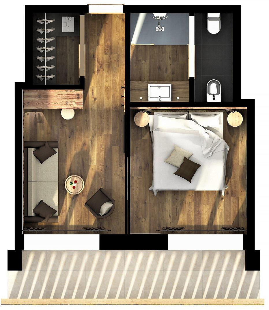 28 m² - pokoj s manželskou postelí a případně rozkládacím gaučem pro 1 či 2 osoby, sociální zařízení, balkon; pokoje mohou být odděleny jen částečně stěnou