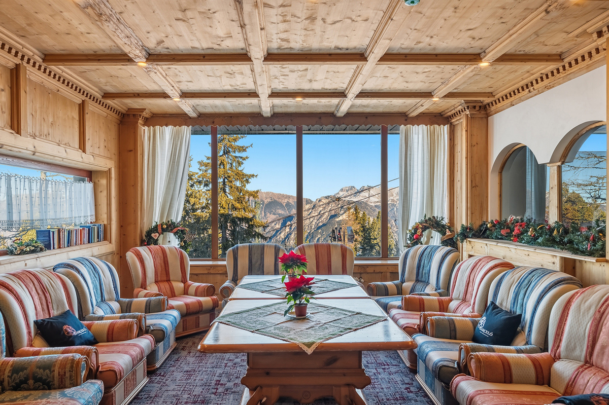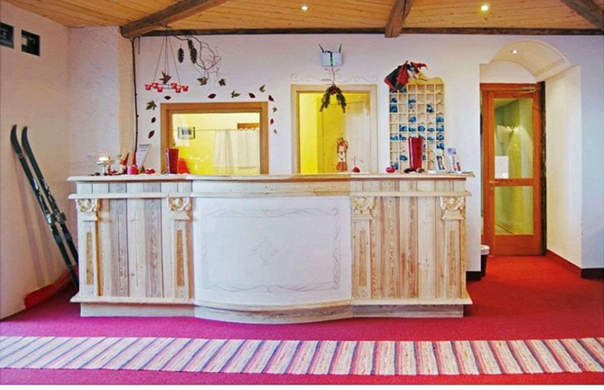 recepce / menší lobby s krbem / bar, restaurace / pizzerie self servis na svahu jen na obědy, restaurace, venkovní apres ski bar u sjezdovky se sluneční terasou a lehátky, společenská místnost s TV sat., menší sluneční terasa s lehátky, dětský koutek, hotelový trezor