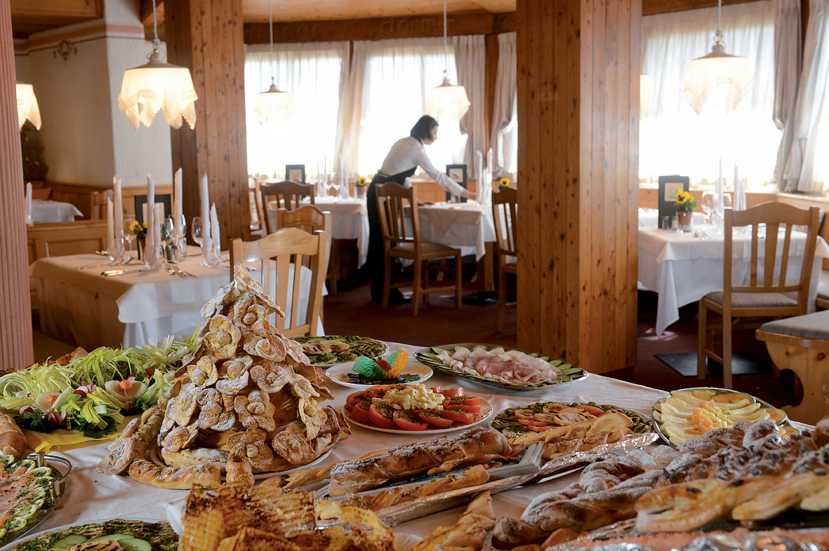 servírované menu s výběrem ze 2 předkrmů, 3 až 4 prvních chodů a 3 až 4 hlavních jídel s přílohou, salátový bufet, servírovaný dezert, nápoje za poplatek