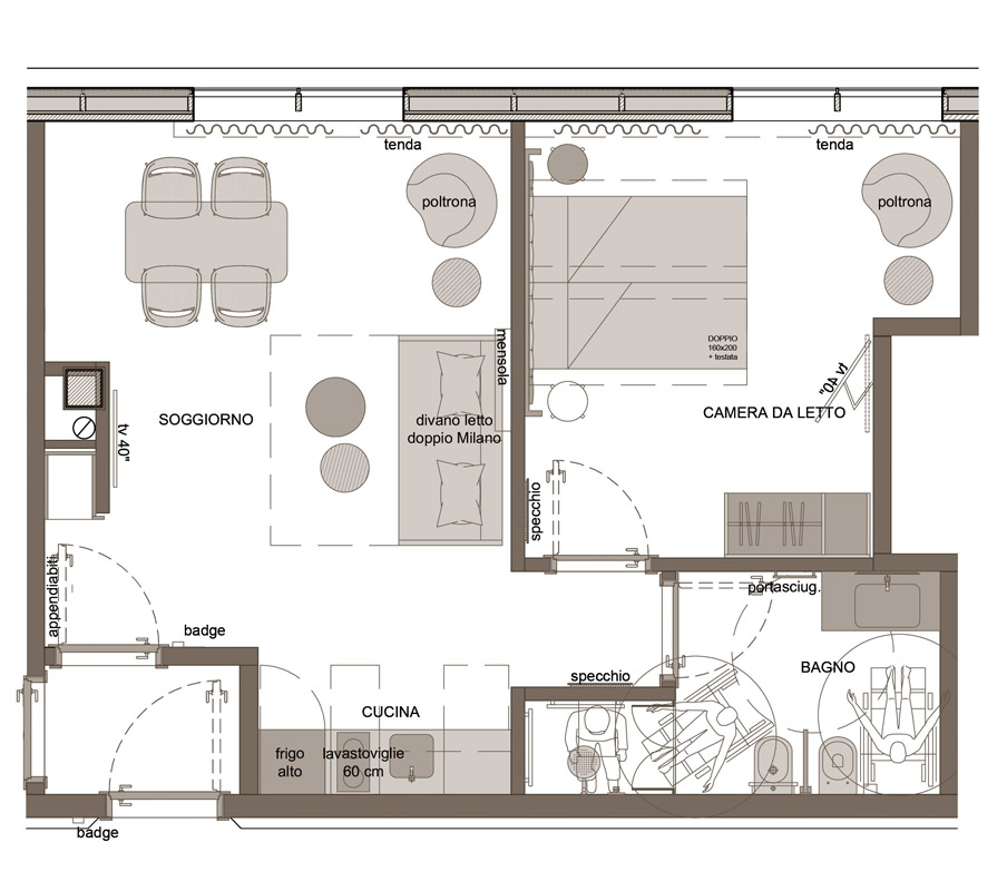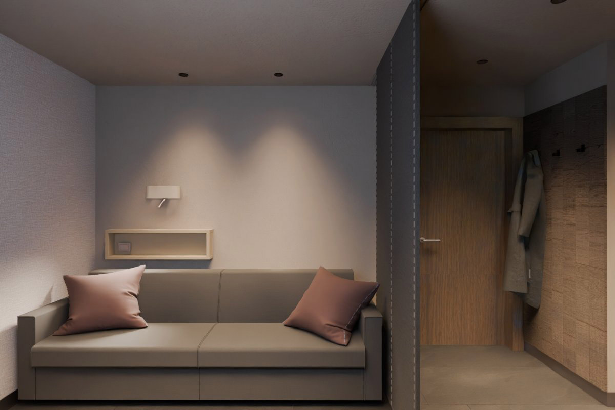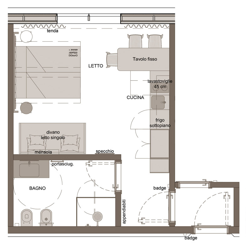 1 ložnice s manželskou postelí oddělená od obývací části posuvnou stěnou, obývací pokoj s kuchyňským koutem a rozkládacím gaučem pro 1 či 2 osoby, sociální zařízení se sprchou