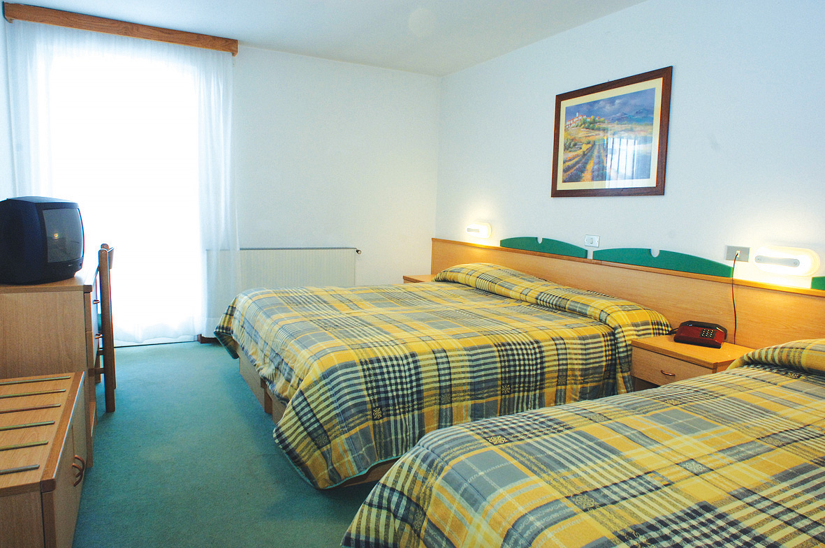 pokoj s 1 či 2 samostatnými lůžky či manželskou postelí a případně 1 dalším samostatným lůžkem či palandou, sociální zařízení