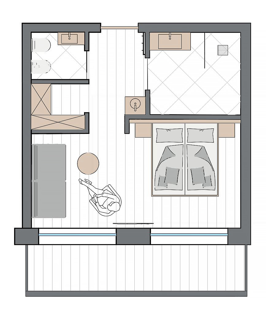 26 až 28 m² - pokoj s manželskou postelí a rozkládacím gaučem pro 2 osoby, sociální zařízení, balkon