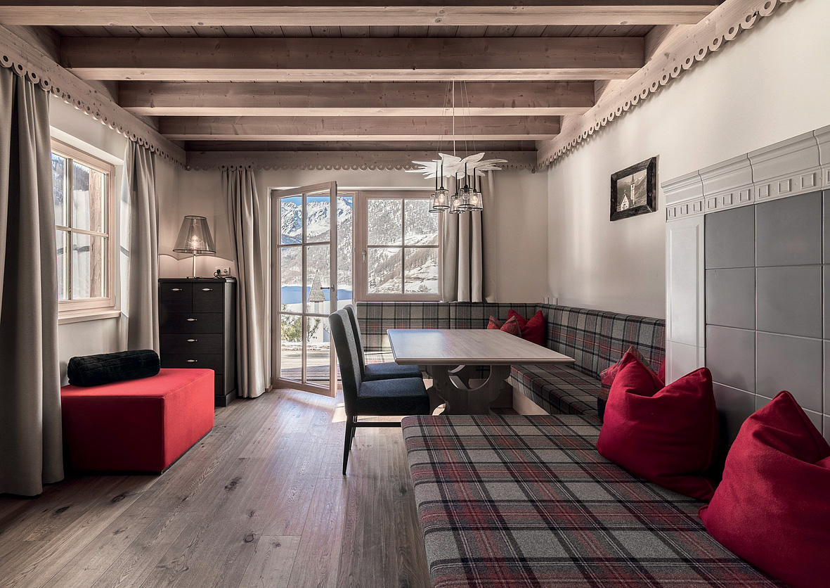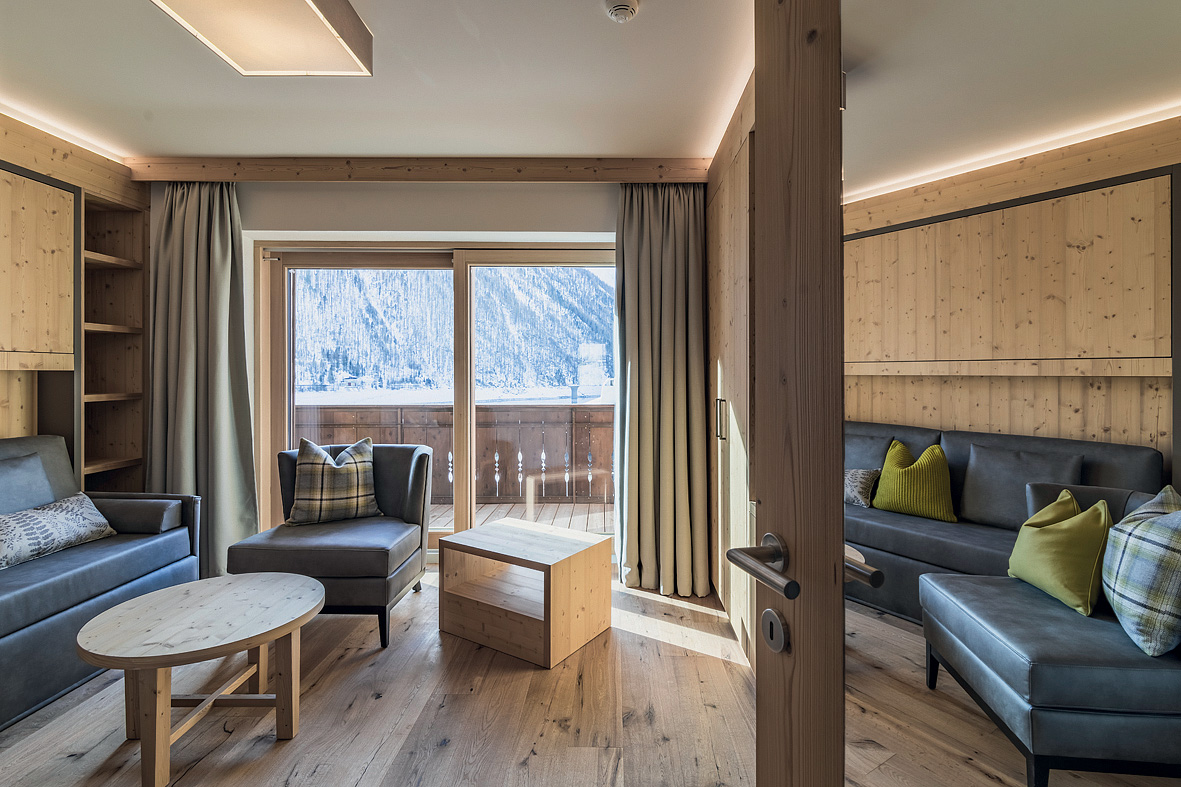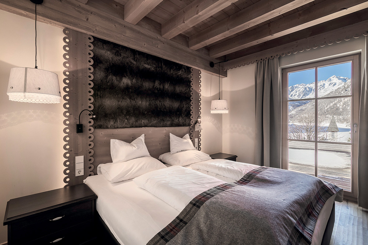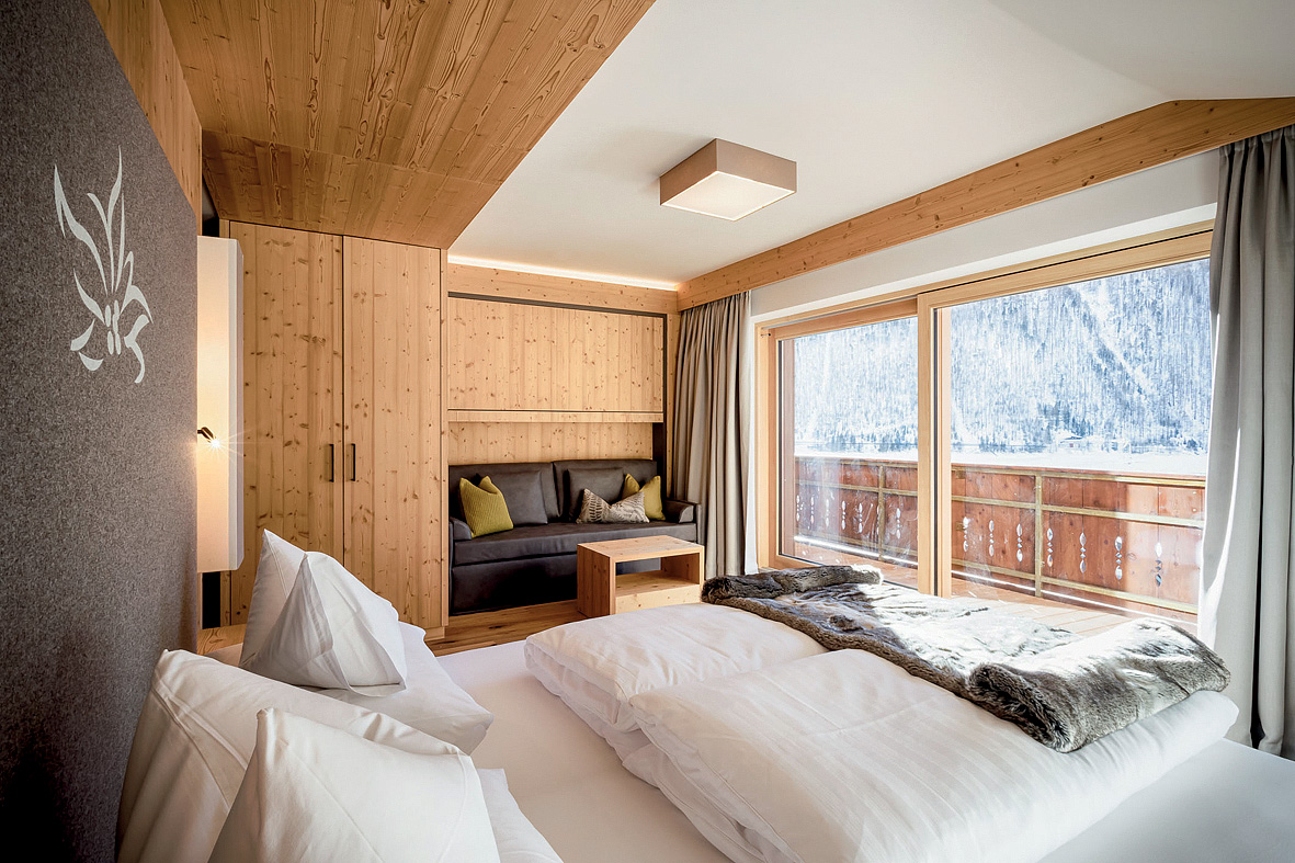 30 m² - pokoj s manželskou postelí či 2 samostatnými lůžky a případně 1 dalším samostatným lůžkem, sociální zařízení se sprchou či vanou, balkon s výhledem na hory