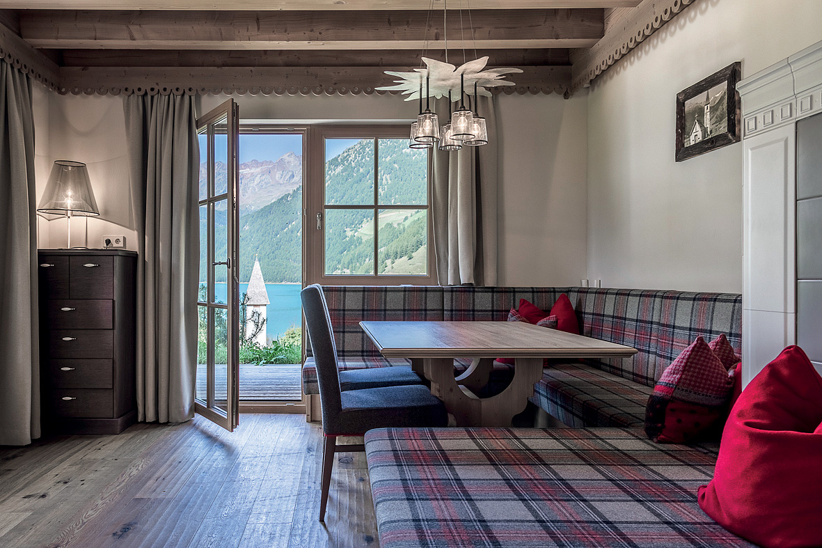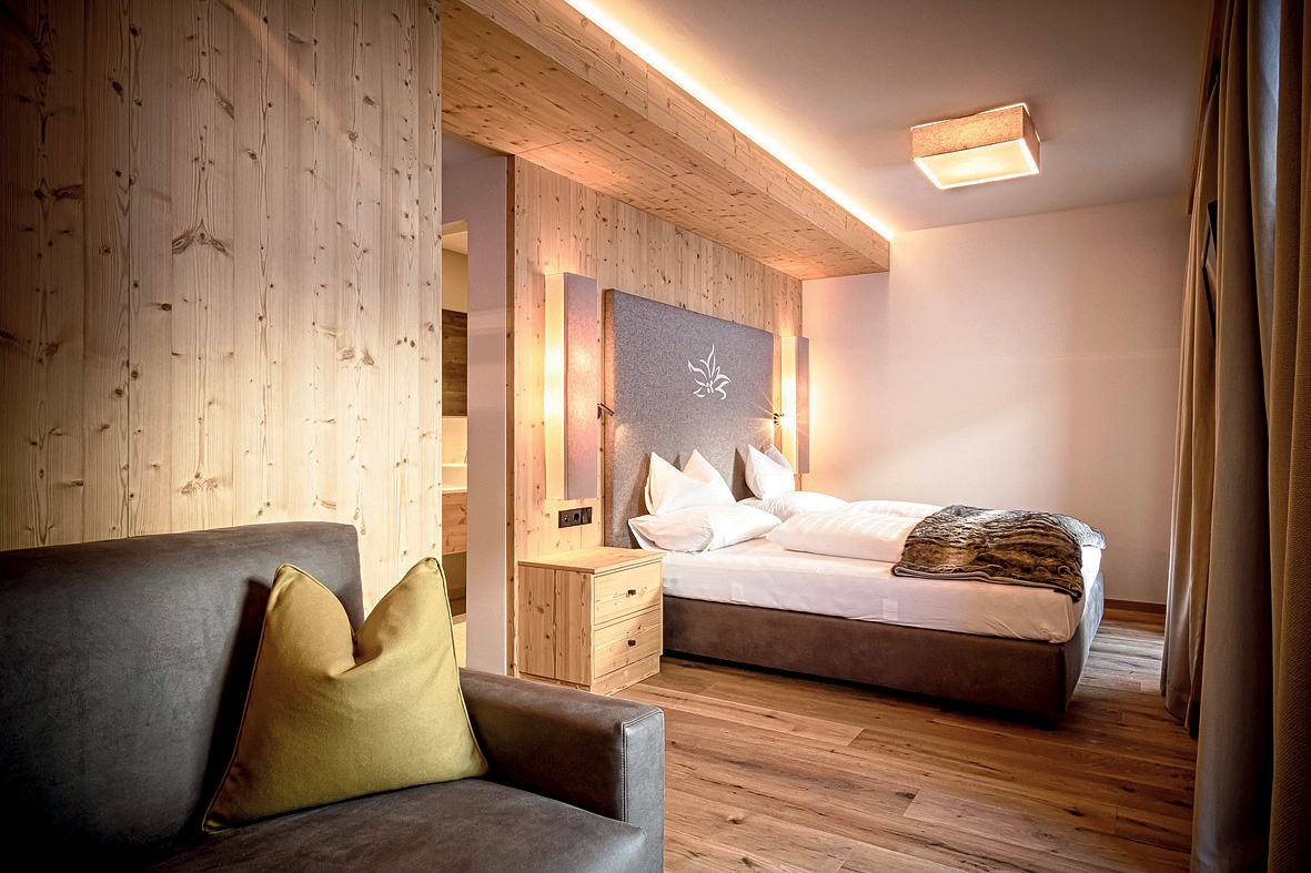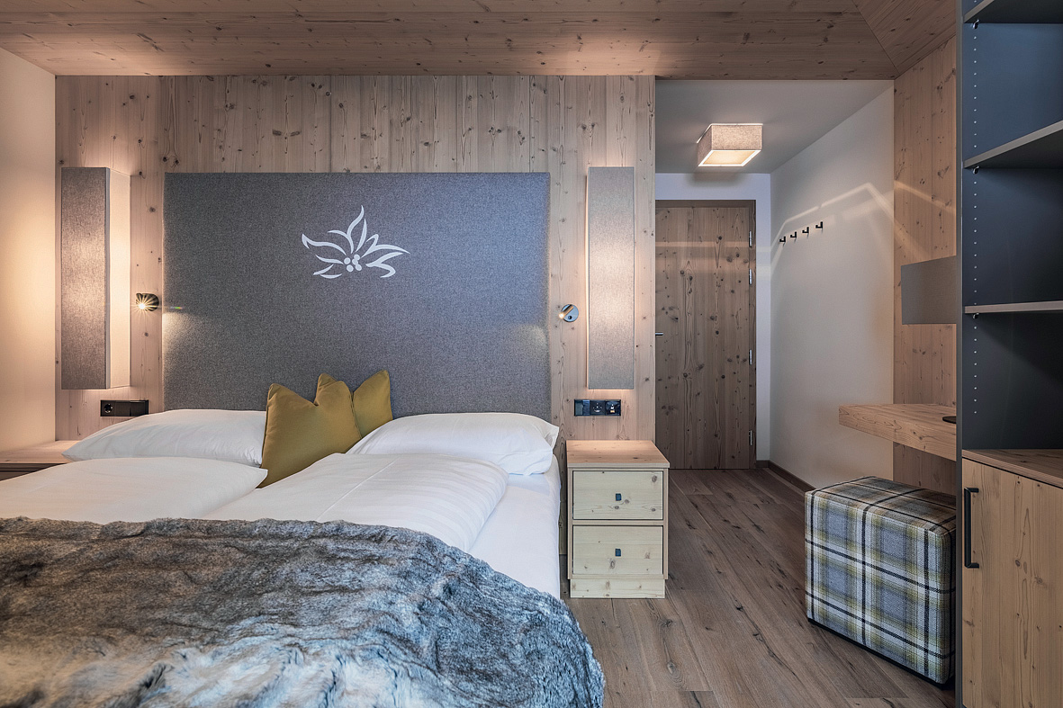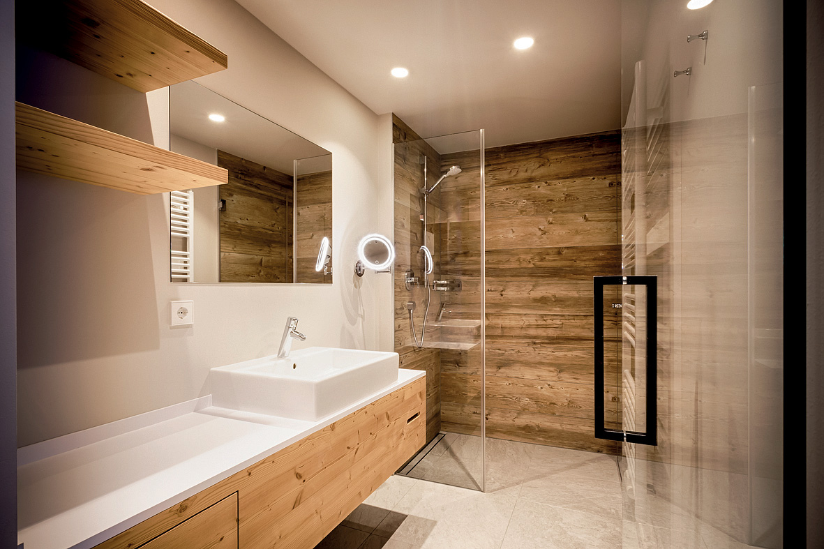 30 m² - pokoj s manželskou postelí či 2 samostatnými lůžky a případně 1 dalším samostatným lůžkem, sociální zařízení se sprchou či vanou, balkon s výhledem na hory
