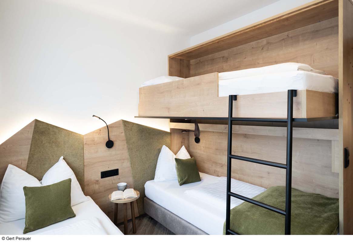 Junior Suite Superior 4/5 - 33 m² - pokoj s manželskou postelí, menší ložnice s palandou a případně přistýlkou formou "šuplíku" pod palandou pro 1 osobu, předsíň, sociální zařízení, oddělené WC, balkon; minimální obsazenost pokoje jsou 2 dospělé osoby a 2 děti od 6 let