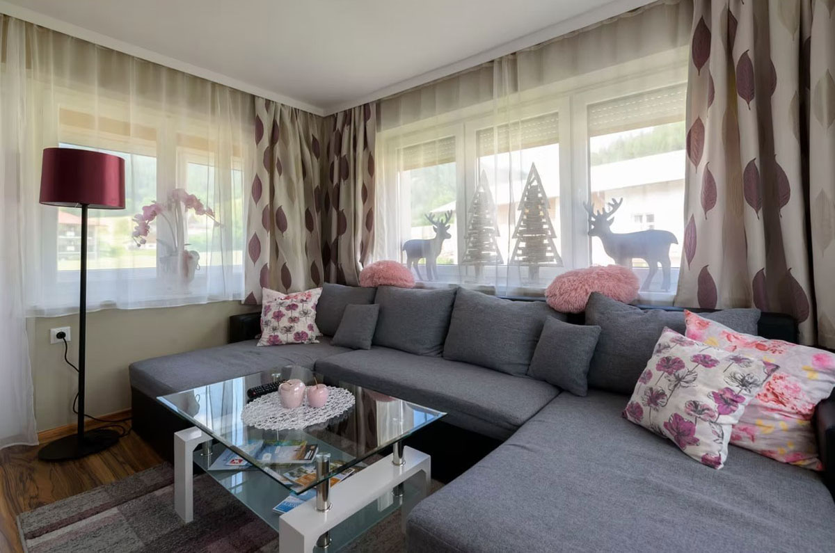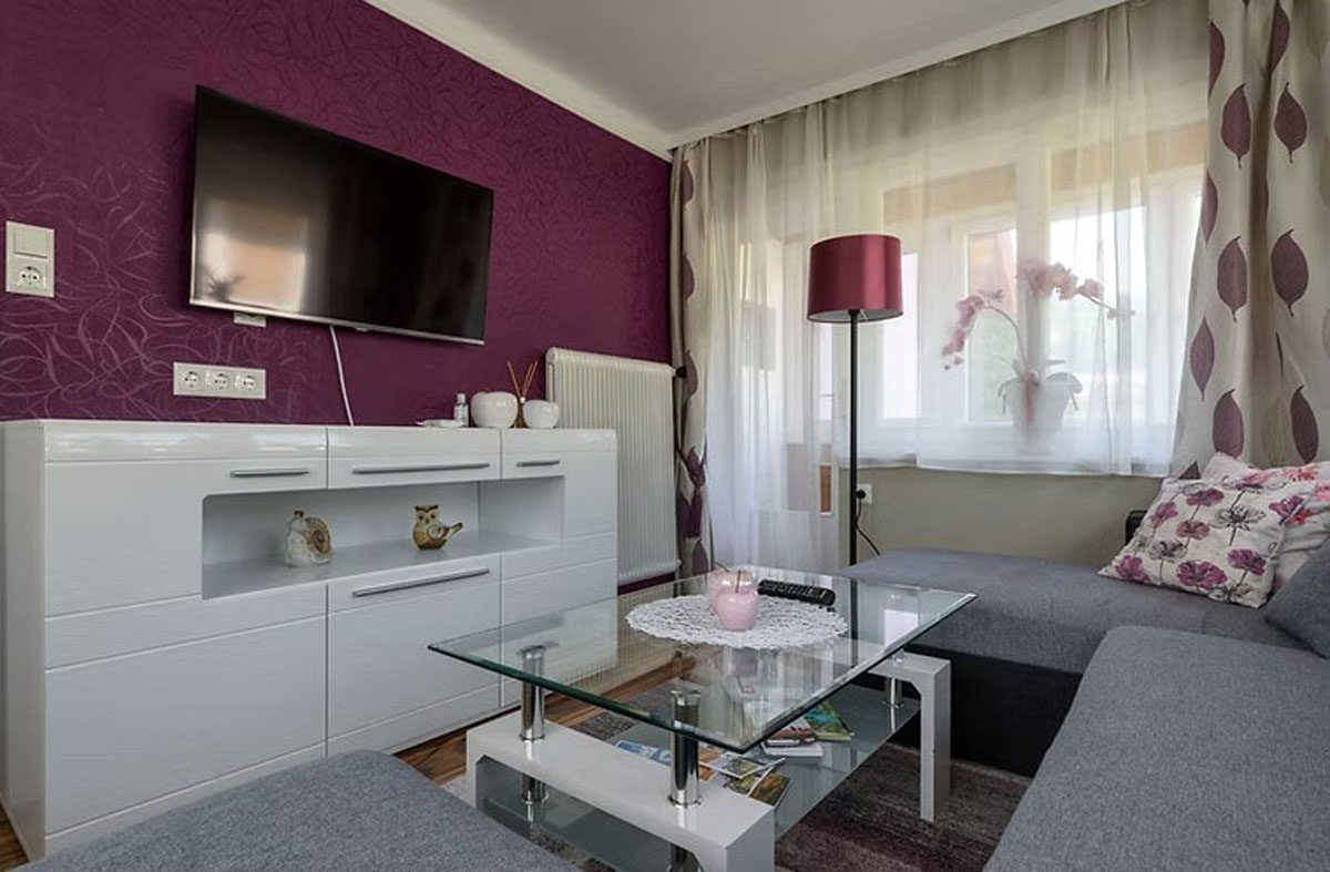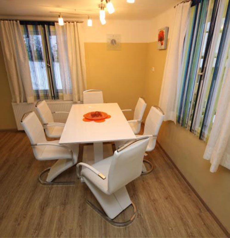 80 m² - přízemí apartmánu: ložnice s manželskou postelí a gaučem, obývací pokoj s rozkládacím gaučem až pro 2 osoby, samostatná kuchyň, sociální zařízení s vanou, balkon
