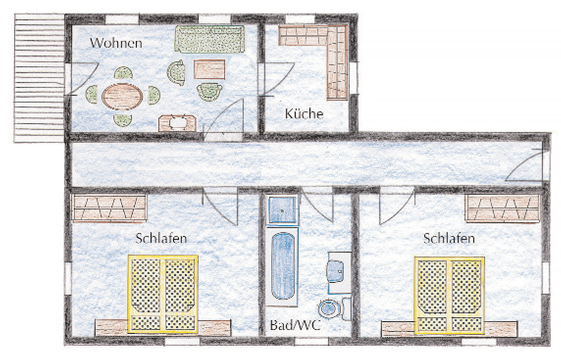 1 ložnice s manželskou postelí a případně 1 samostatným lůžkem, ložnice s manželskou postelí či 2 samostatnými lůžky, obývací pokoj s gaučem, samostatná kuchyň, sociální zařízení se sprchou či vanou, zpravidla balkon
