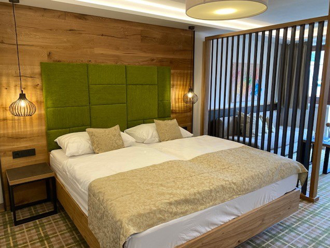 Deluxe 4 typ A - 35 m² - pokoj s manželskou postelí a případně rozkládacím gaučem až pro 2 osoby, sociální zařízení s vanou či sprchou, balkon; pokoje jsou vždy v nové části hotelu přistavěné v roce 2016