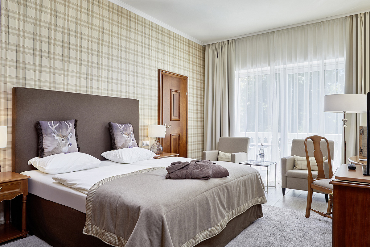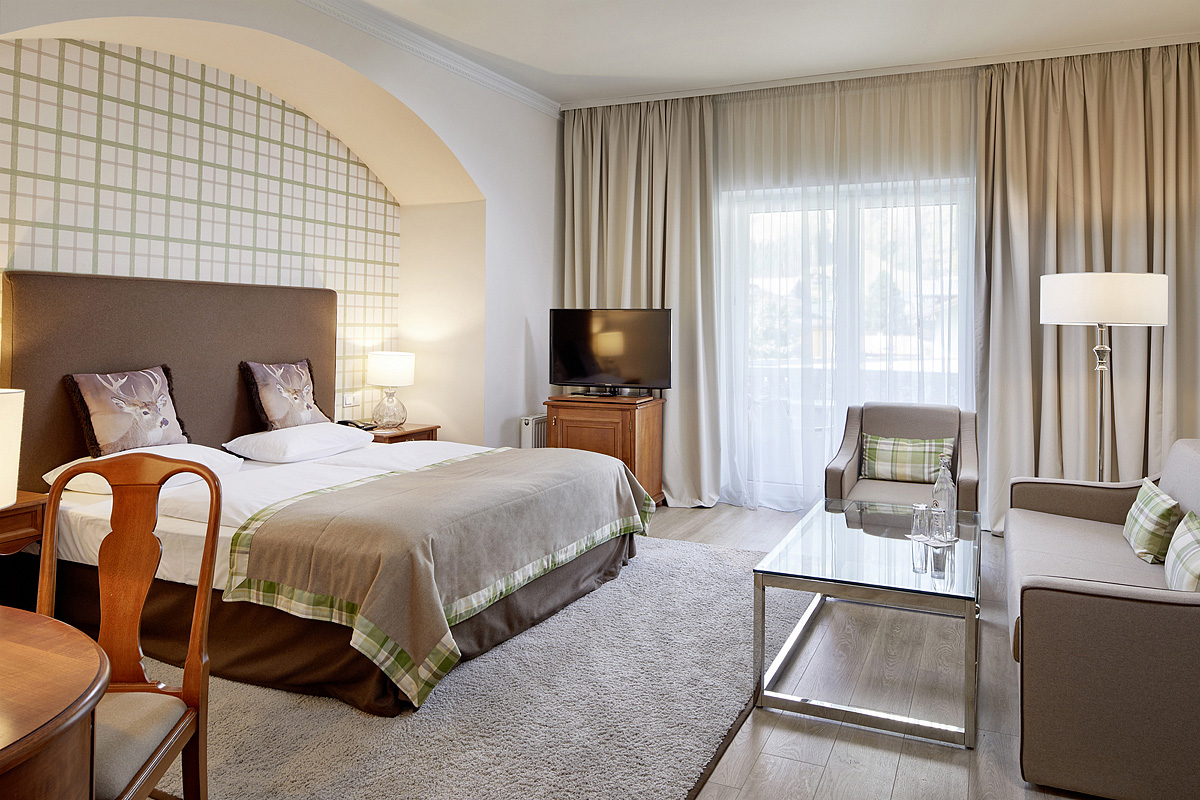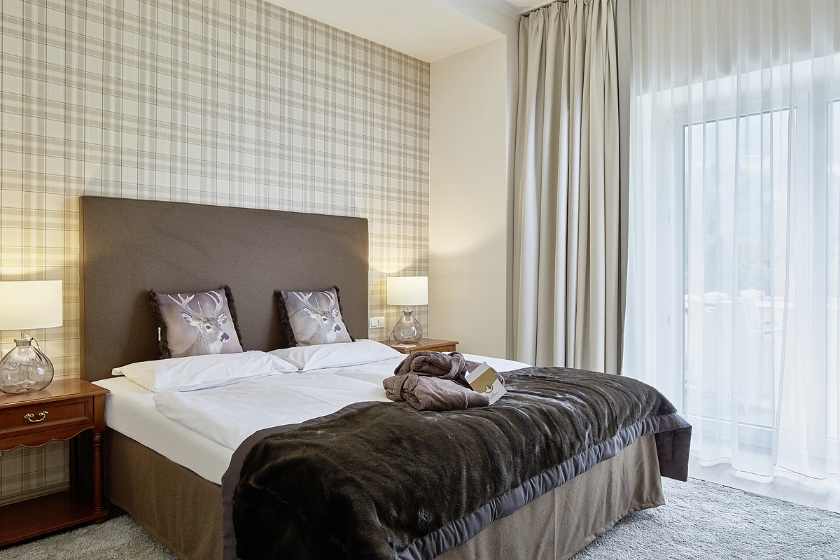 pokoj s manželskou postelí a případně rozkládacím gaučem pro 1 dospělou osobu a 1 dítě do nedovršených 15 let, sociální zařízení se sprchou či vanou, balkon