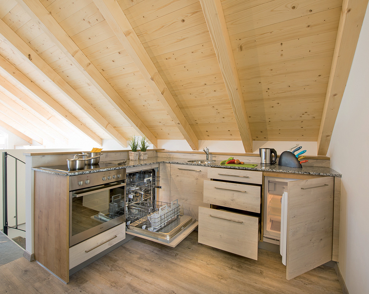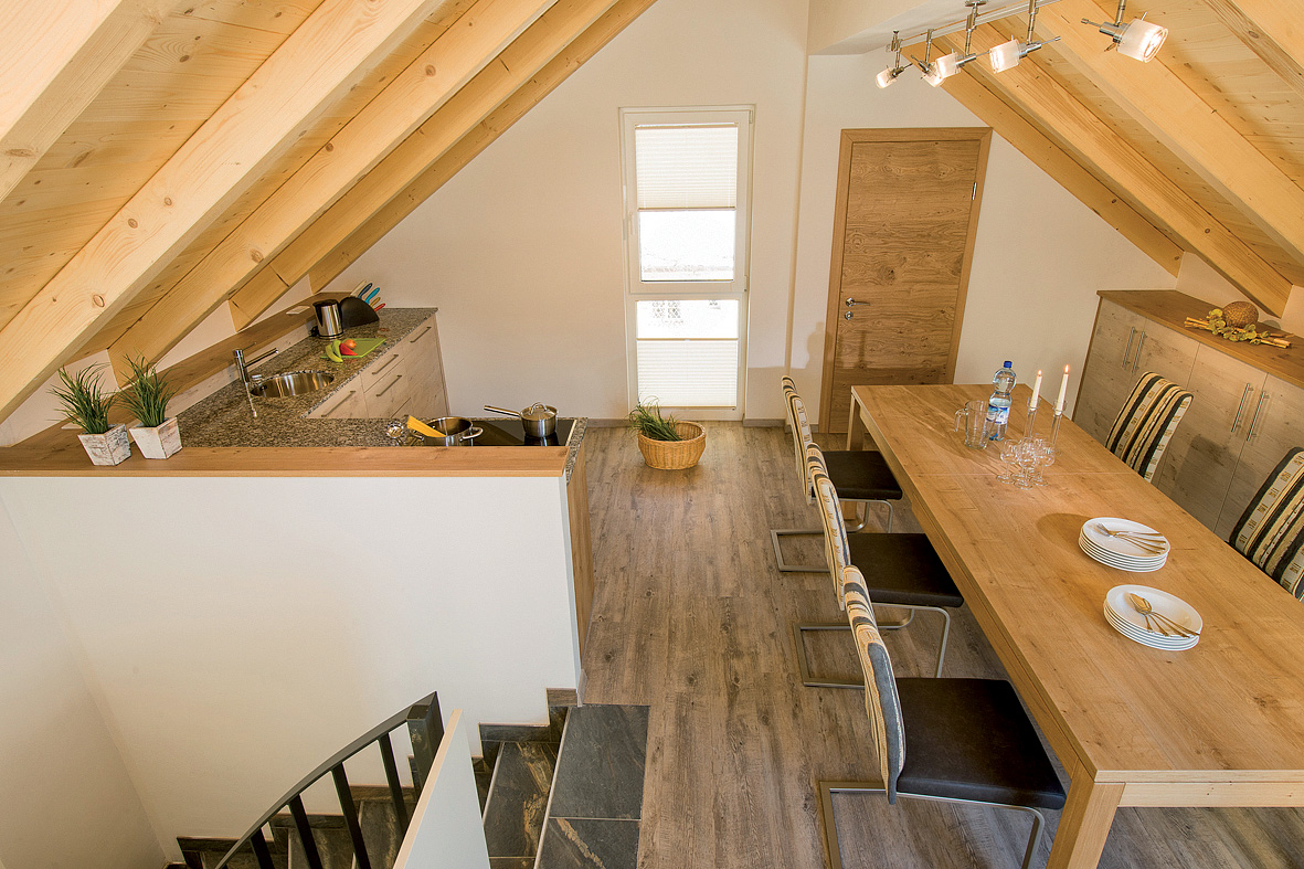 trilo 8 - Penthause - 80 m² - 1. podlaží apartmánu: obývací pokoj s kuchyňským koutem a rozkládacím gaučem pro 2 osoby, sociální zařízení, oddělené WC, balkon či terasa, 2. podlaží apartmánu: 1 ložnice s manželskou postelí, 1 ložnice s manželskou postelí a palandou, sociální zařízení; minimální obsazenost apartmánu jsou 4 osoby