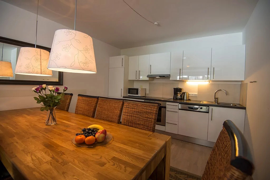 70 m² - 2x ložnice s manželskou postelí, ložnice s 2 samostatnými lůžky, obývací pokoj s rozkládacím gaučem pro 2 osoby a kuchyňským koutem, 2x sociální zařízení, balkon