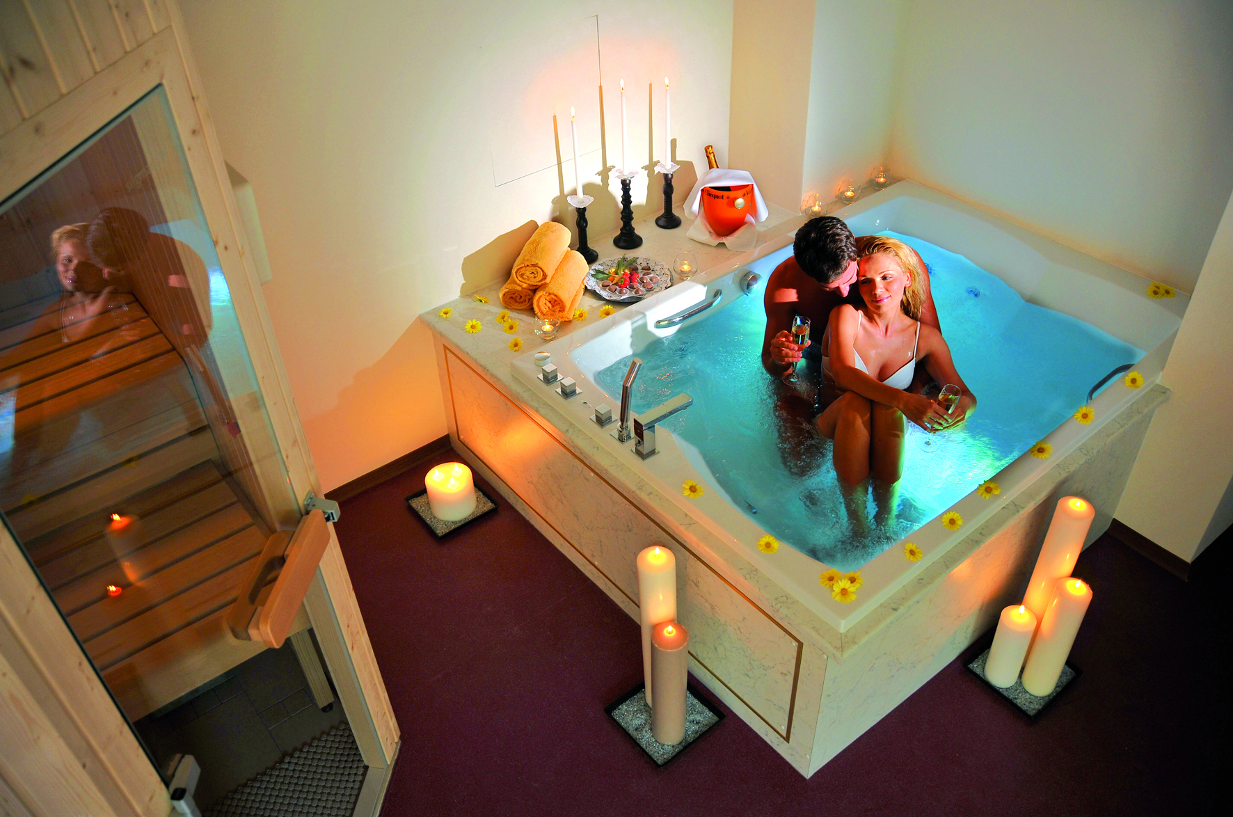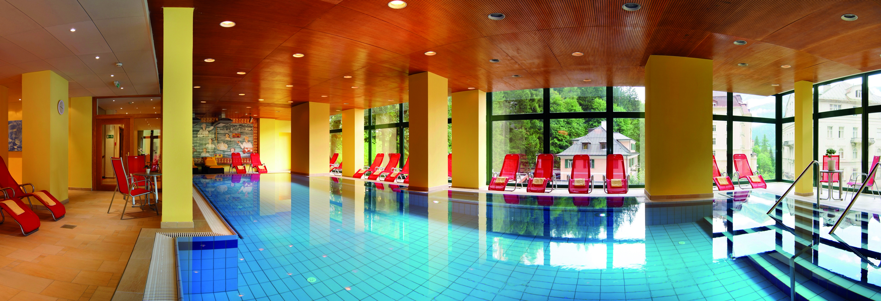 bazén 13 x 6 m, termální bazén s vířivkou, 3x finská sauna#, bio sauna#, pára#, hydromasážní sprcha#, tepidárium, relaxační koutek s lehátky#, masáže*, posilovna, stolní tenis, stolní fotbal; služby označené # jsou pro děti přístupné až od 14 let a jen v doprovodu dospělé osoby