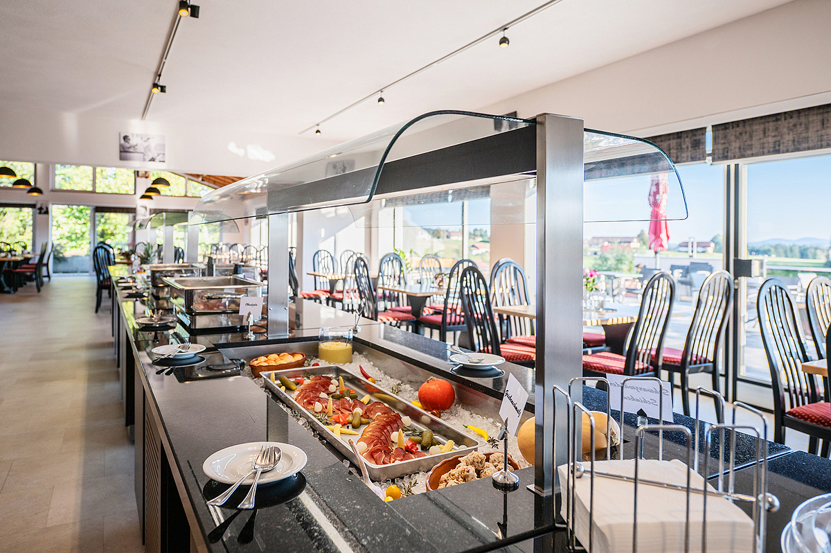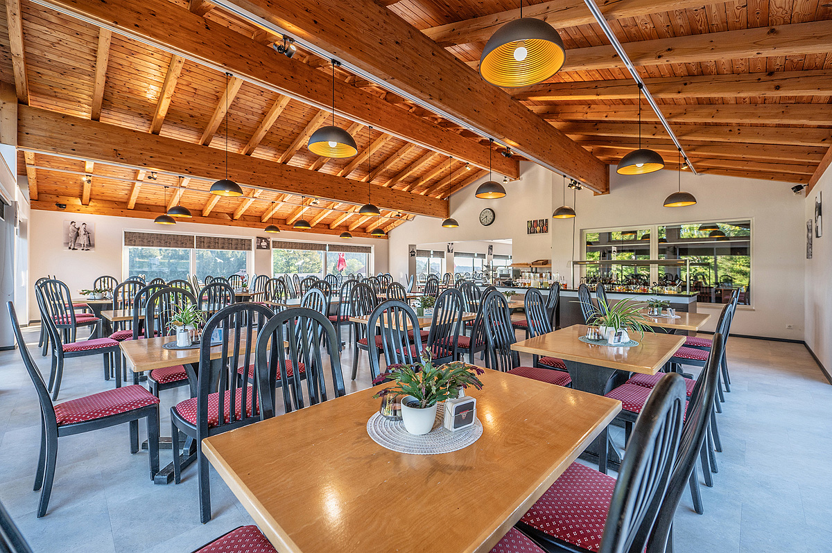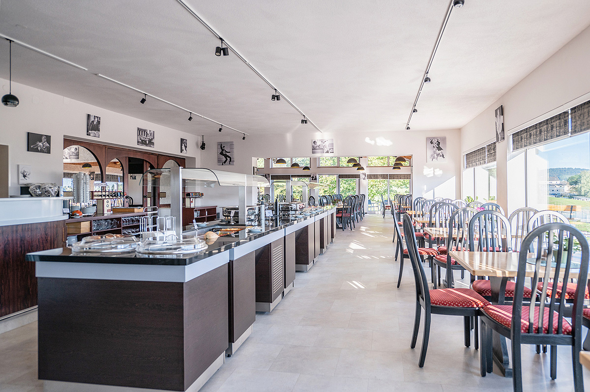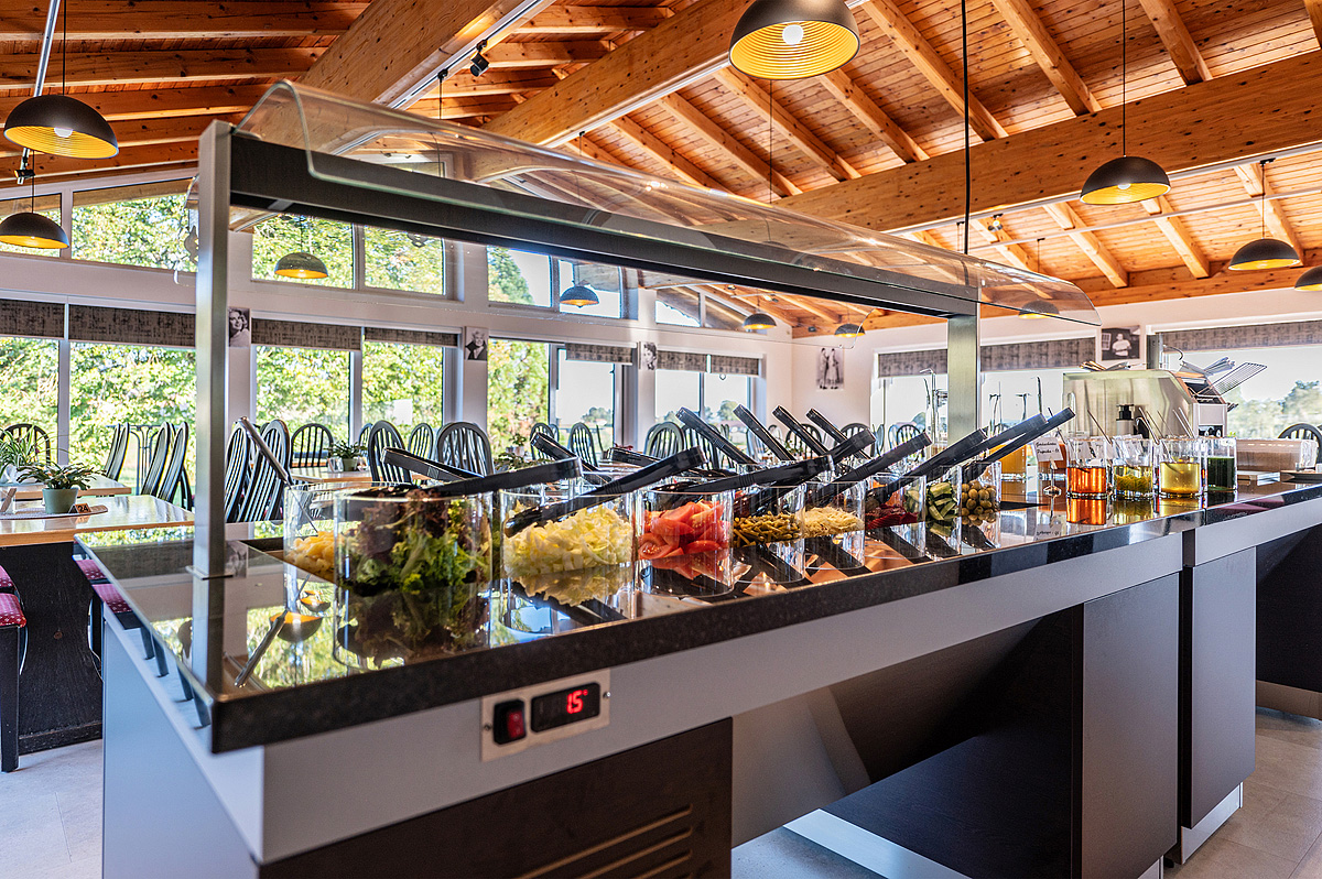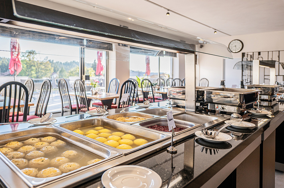 formou bufetu s výběrem z 3 hlavních jídel s přílohou, polévka, saláty a dezerty formou bufetu, od 10.00 do 22.00 hodin vybrané nealkoholické nápoje, od 12.00 do 22.00 hodin točené pivo a stolní víno; ostatní nápoje za poplatek; speciální pokrmy pro bezlaktózové, bezlepkové a jiné diety bohužel nejsou možné