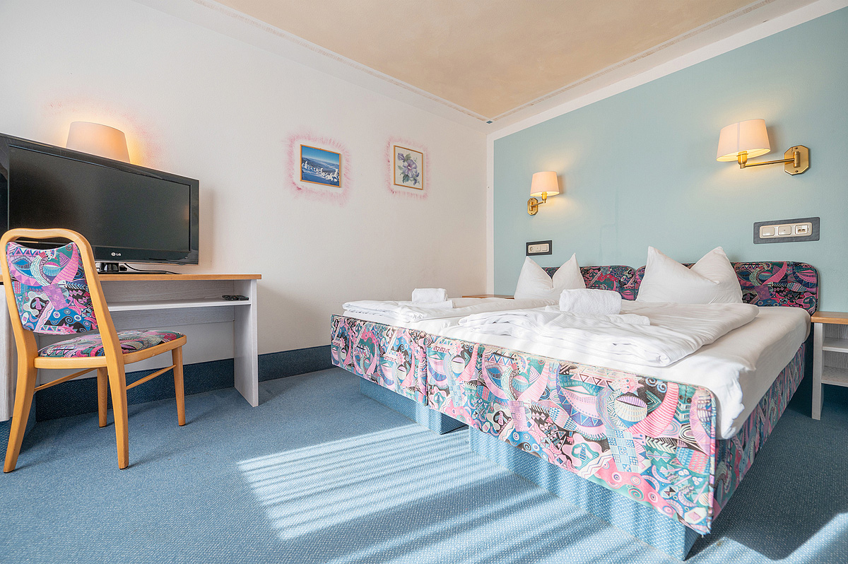 12 m² - pokoj s 1 samostatným lůžkem, sociální zařízení se sprchou či vanou, zřídka balkon; nelze infant nad rámec maximální obsazenosti pokoje