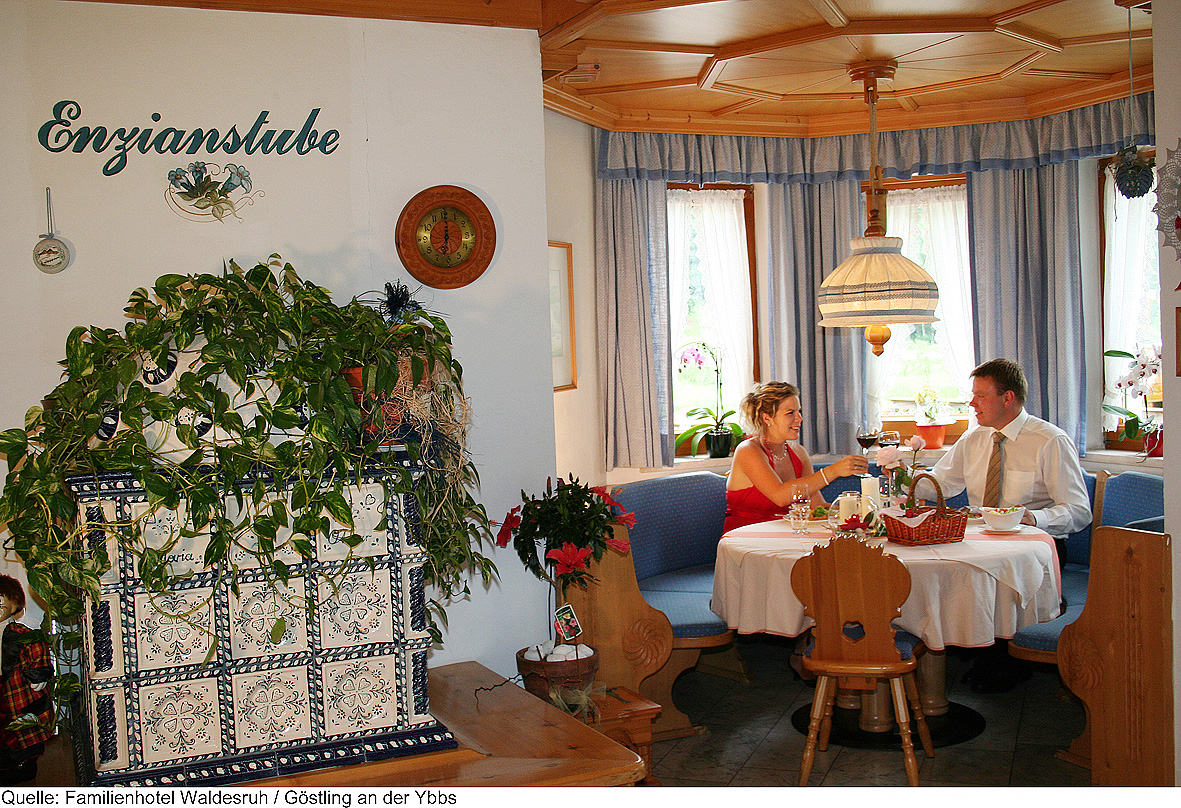 recepce / lobby, restaurace vyhrazená pro hotelové hosty, à la carte restaurace, stylová restaurace / vinný sklípek "Enzianstube", bar, seminární místnost, wi-fi připojení k internetu, dětský koutek, úschovna lyží, vyhrazené parkoviště
