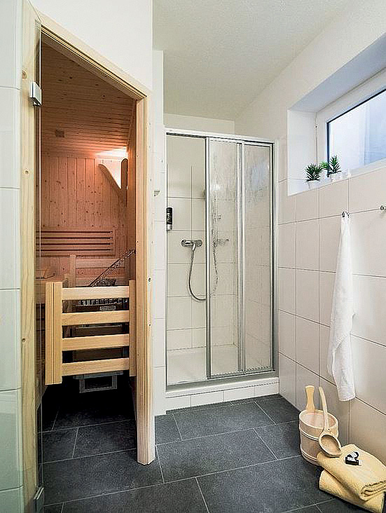 110 až 120 m² - 3 ložnice s manželskou postelí, obývací pokoj s kuchyňským koutem a případně rozkládacím gaučem pro 2 osoby, předsíň / šatna, zřídka privátní sauna (na vyžádání), 3x sociální zařízení se sprchou či vanou, terasa s předzahrádkou