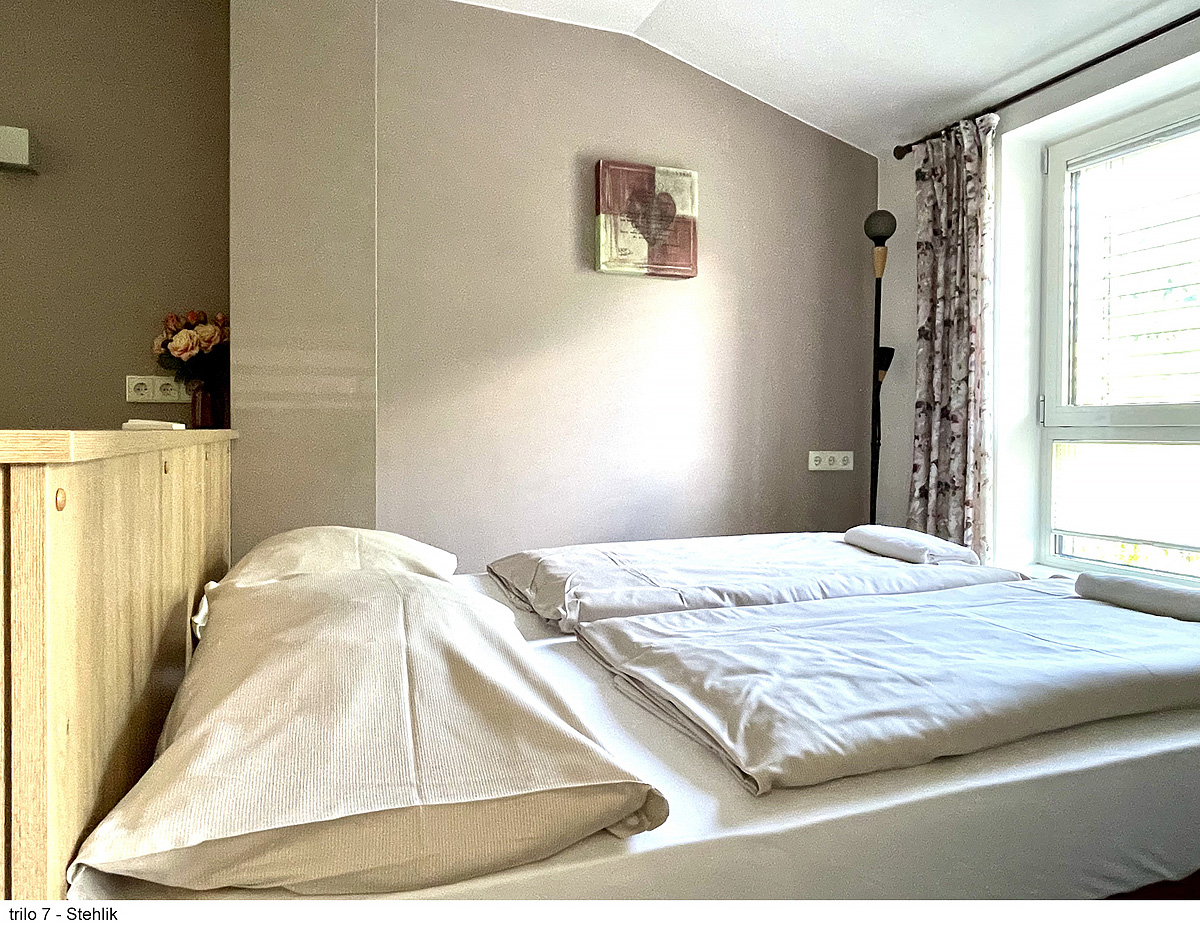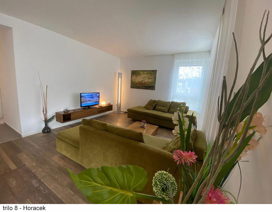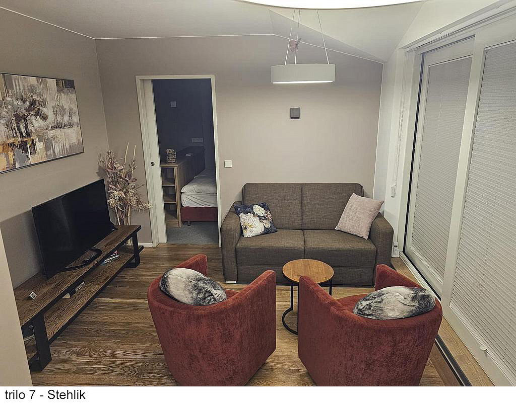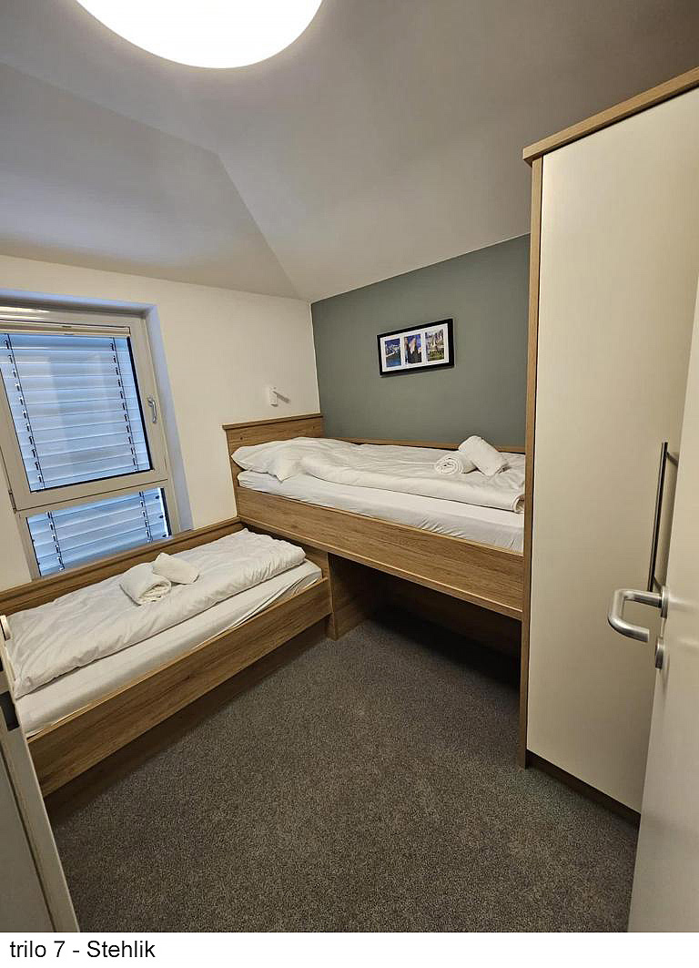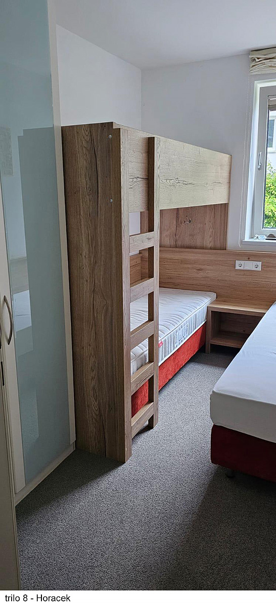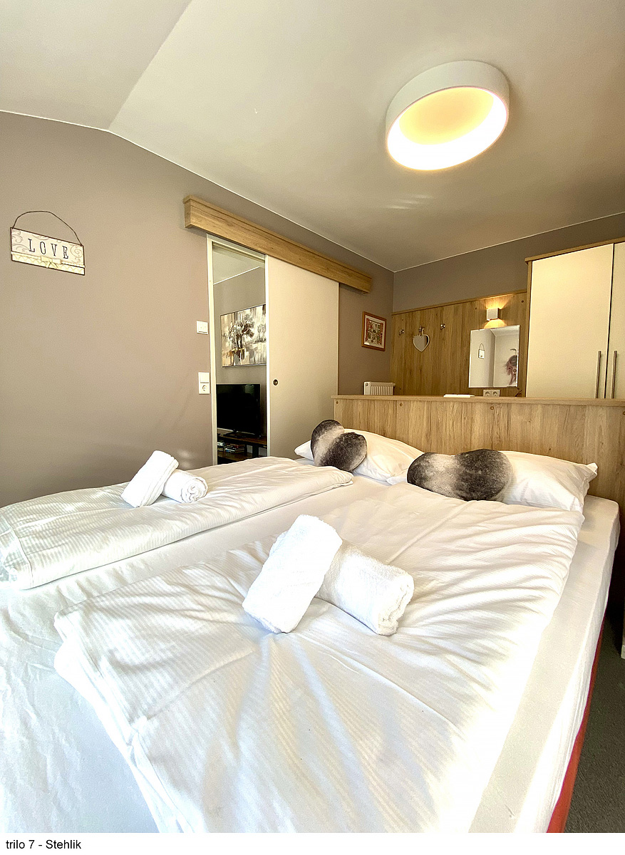 trilo 7 - 1 ložnice s manželskou postelí, 1 ložnice s atypickou palandou pro 2 osoby a možností přistýlky pro 1 osobu, obývací pokoj s kuchyňským koutem a rozkládacím gaučem pro 2 osoby, 2x sociální zařízení, balkon