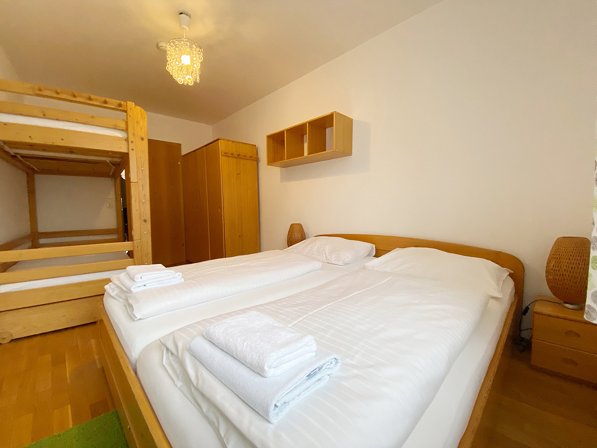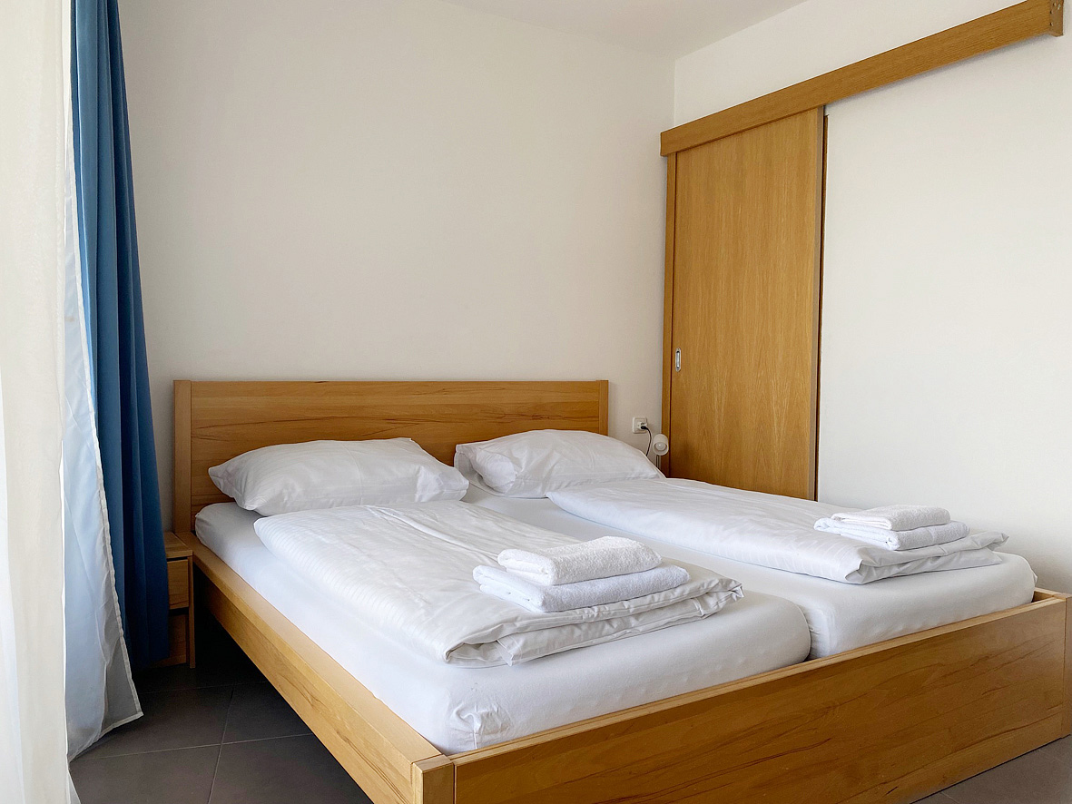 65 m² - 1 ložnice s manželskou postelí, 1 ložnice s manželskou postelí a palandou, obývací pokoj s kuchyňským koutem a rozkládacím gaučem pro 2 osoby, sociální zařízení, terasa