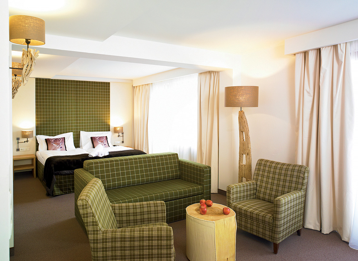 30 m² - pokoj s manželskou postelí a případně rozkládacím gaučem pro 1 osobu, sociální zařízení se sprchou či vanou, balkon; infant nad rámec max. obsazenosti není povolen