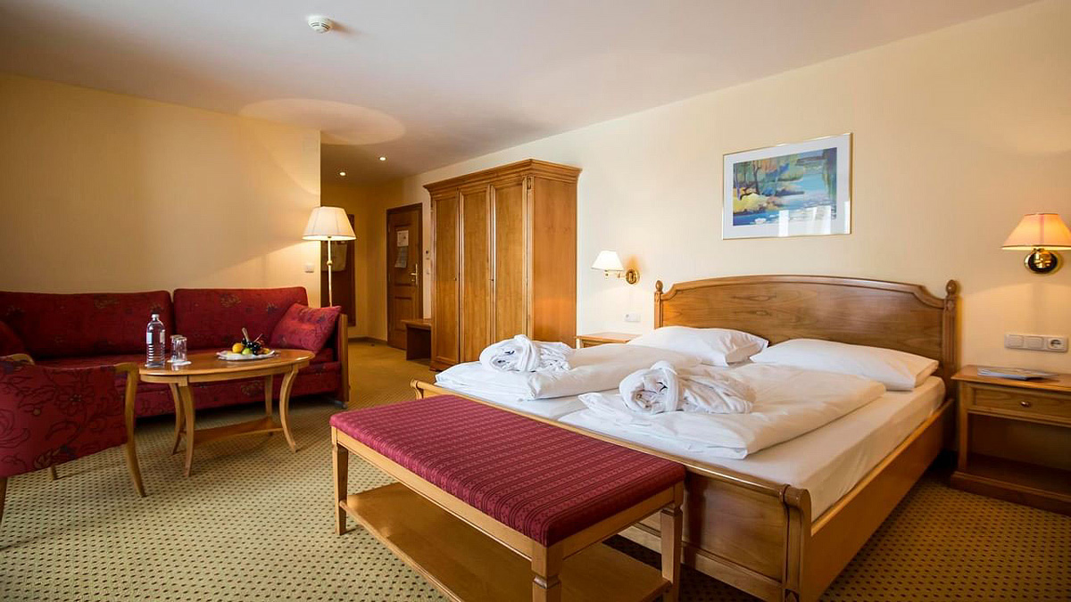 Junior Suite Deluxe 2+2 - 47 m² - ložnice s manželskou postelí, obývací pokoj s rozkládacím gaučem až pro 2 děti do nedovršených 18 let, sociální zařízení se sprchou či vanou, balkon; pokoje jsou v nové budově propojené s hlavní budovou výtahem; minimální obsazenost 2 dospělé osoby a 1 dítě; nelze infant nad maximální obsazenost pokoje