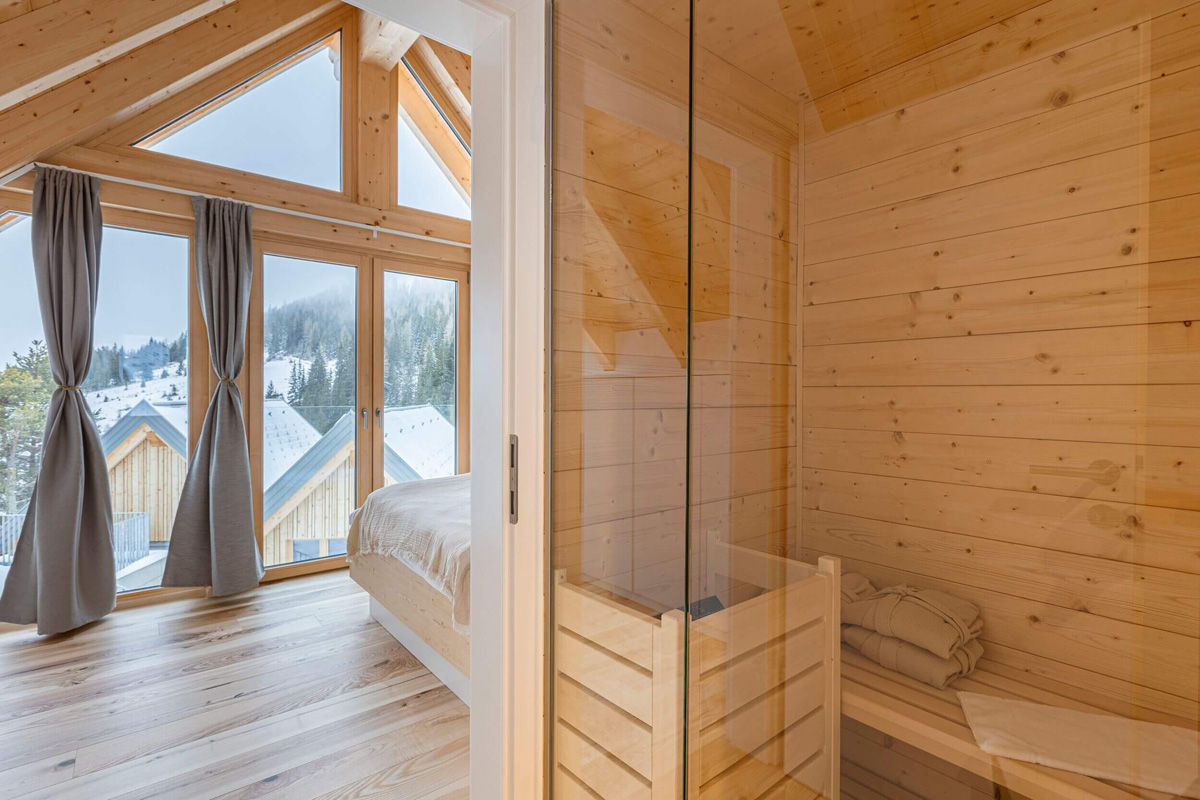 80 m² - 2 ložnice s manželskou postelí, ložnice s palandou pro 2 osoby, obývací pokoj s kuchyňským koutem a rozkládacím gaučem pro 2 osoby, 1x sociální zařízení, 1x sociální zařízení s privátní finskou saunou, oddělené WC, balkon či terasa; chalety jsou zpravidla dvoupodlažní a v jedné z ložnic je zpravidla volně stojící vana