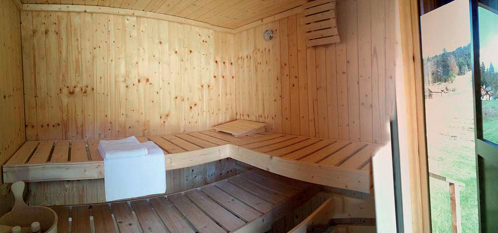 122 m² - 1. podlaží chaletu: obývací pokoj s kuchyňským koutem a gaučem, privátní sauna, sociální zařízení, terasa; 2. podlaží chaletu: 3 ložnice s manželskou postelí a palandou či 2 samostatnými lůžky, 1x sociální zařízení se sprchou či vanou; všechny chalety jsou podsklepené: úschovna lyží a lyžařských bot, garážová stání