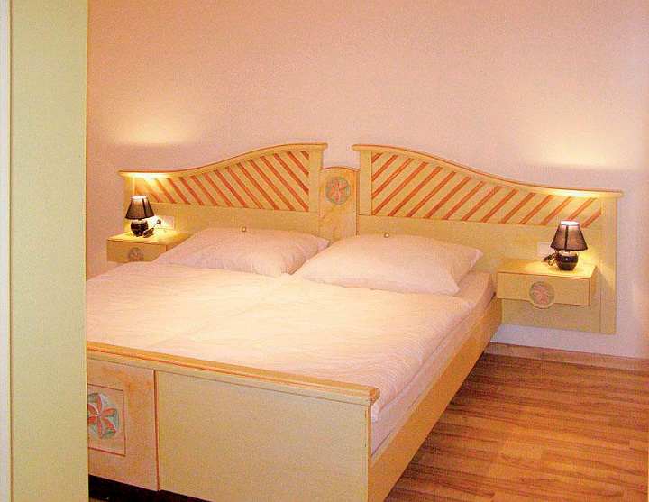 65 až 70 m² - 1 ložnice s manželskou postelí, 1 ložnice zpravidla se 2 samostatnými lůžky (ložnice je situována do velmi nízkého mezonetového podkroví; přístup po příkrých schodech), obývací pokoj s kuchyňským koutem a 2 gauči pro 1 osobu, sociální zařízení, balkon