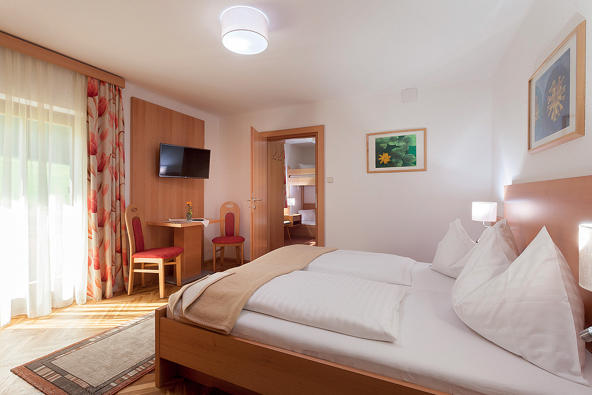 ložnice s manželskou postelí, ložnice s mimoúrovňovou palandou, obývací pokoj s rozkládacím gaučem pro 2 osoby, sociální zařízení, balkon; minimální obsazení pokoje 3 dosp. osoby, maximální obsazení pokoje 4 dosp. osoby a 2 děti do nedovršených 15 let
