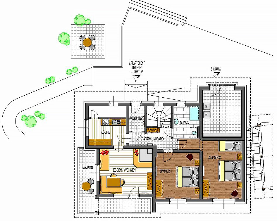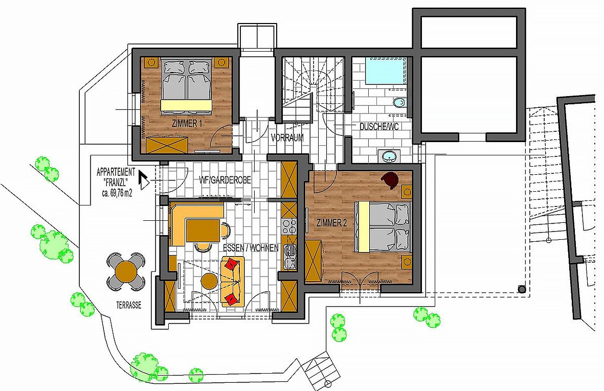 69 m² 2 ložnice s manželskou postelí, obývací pokoj s kuchyňským koutem, sociální zařízení, předsíň, terasa