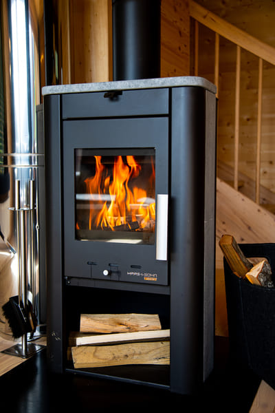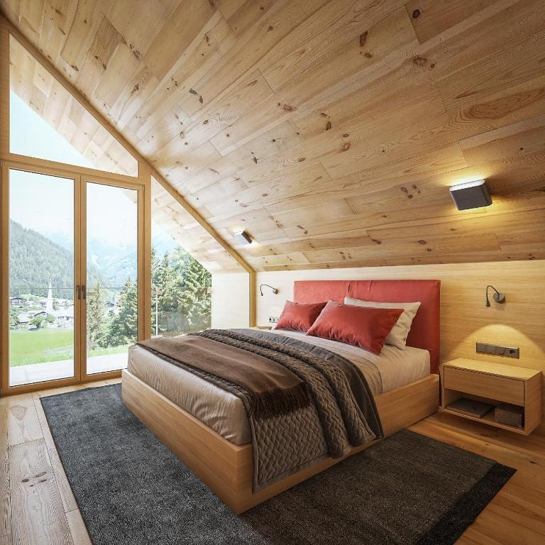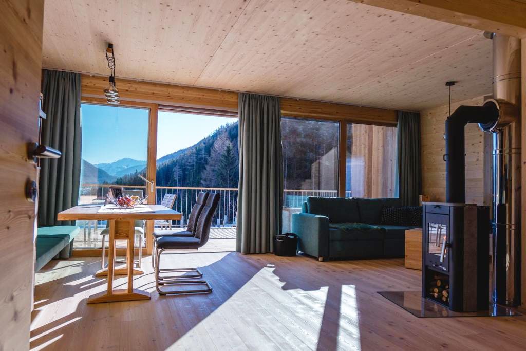 84 m² - 1. podlaží chaletu: obývací pokoj s kuchyňským koutem a rozkládacím gaučem pro 2 osoby, kamna (dřevo volně k dispozici), předsíň, terasa; 2. podlaží chaletu: ložnice s manželskou postelí, ložnice se 2 samostatnými lůžky, sociální zařízení, privátní sauna, oddělené WC