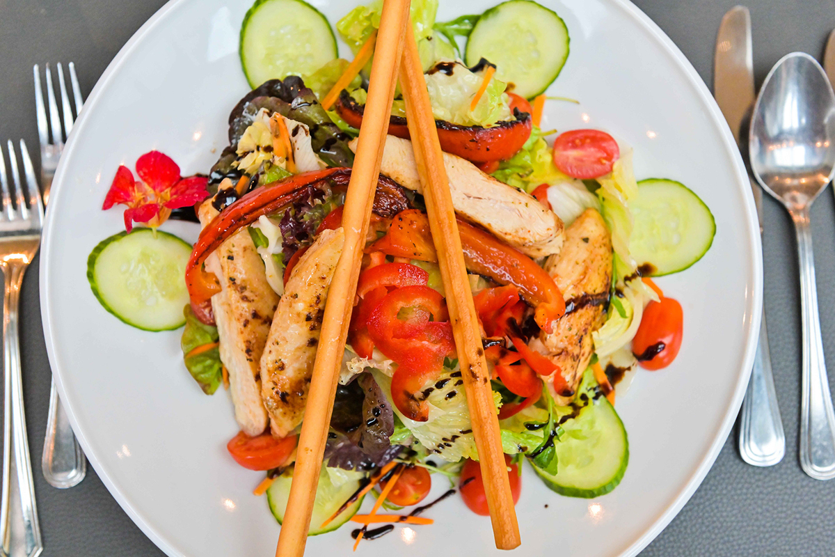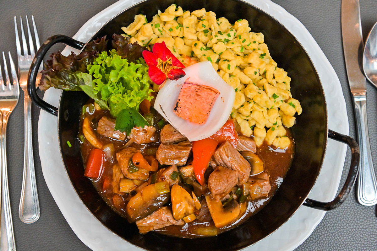 servírované menu s výběrem ze 2 až 3 hlavních jídel s přílohou, servírovaný předkrm či polévka, saláty a dezerty formou bufetu, nápoje za poplatek