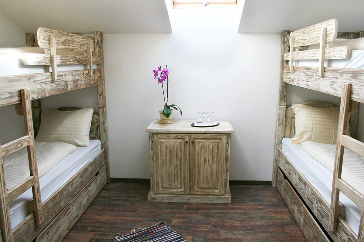 Comfort 6 - 18 až 25 m² - pokoj s manželskou postelí, 3. až 6. lůžka formou 2 paland či 1 palandy a rozkládacího gauče pro 2 osoby, sociální zařízení se sprchou či vanou, zpravidla balkon či terasa; možnost i pokojů se 3 palandami; na vyžádání včetně kalkulace i 1 pokoj až pro 7 osob