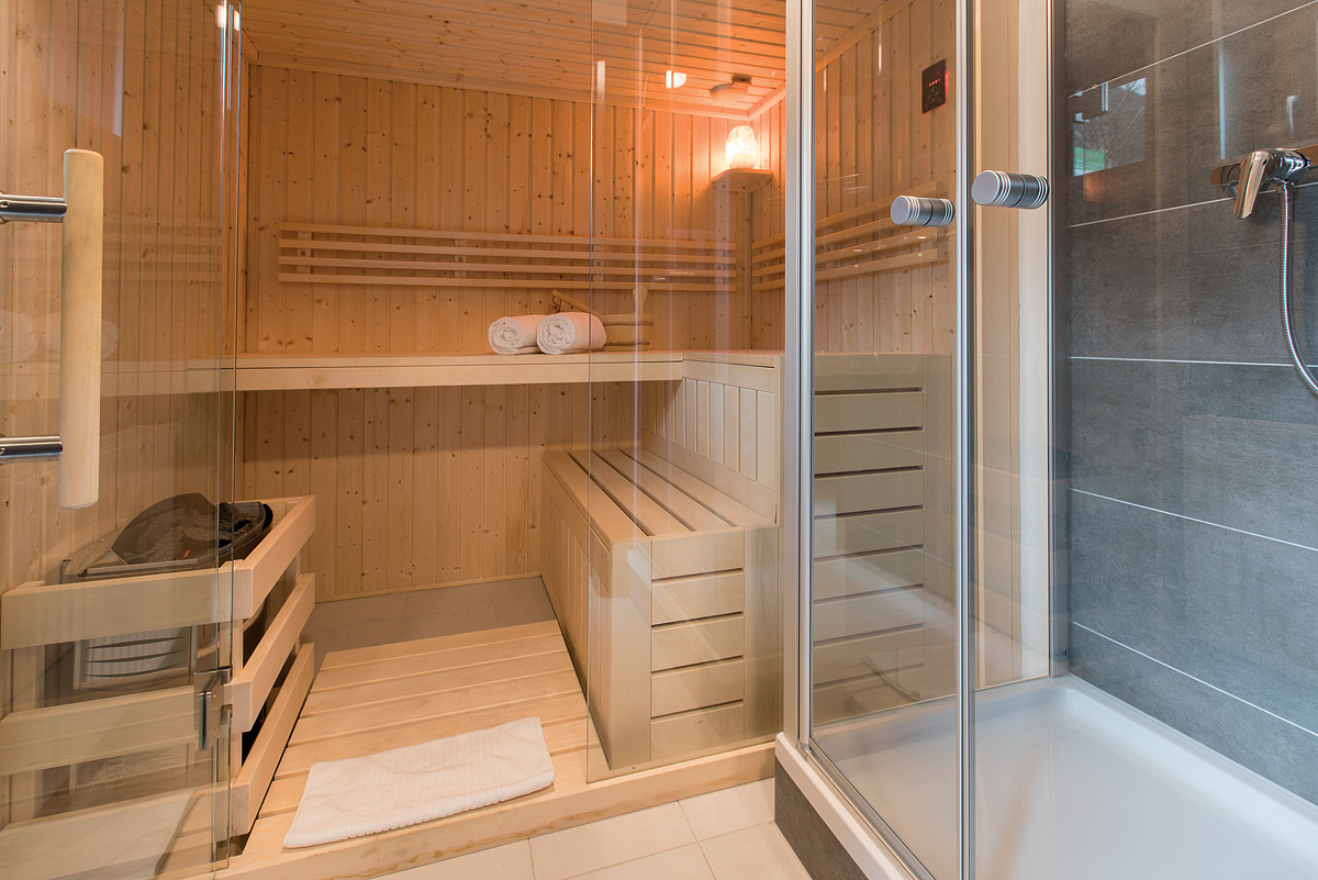 sociální zařízení s privátní saunou, oddělené WC, terasa; 2. podlaží chaletu: 3 ložnice s manželskou postelí, 2x sociální zařízení (vždy přístupné z ložnic), 2x balkon