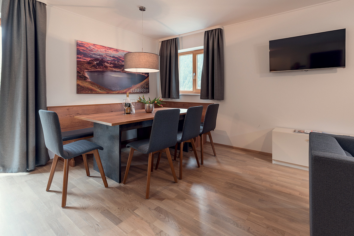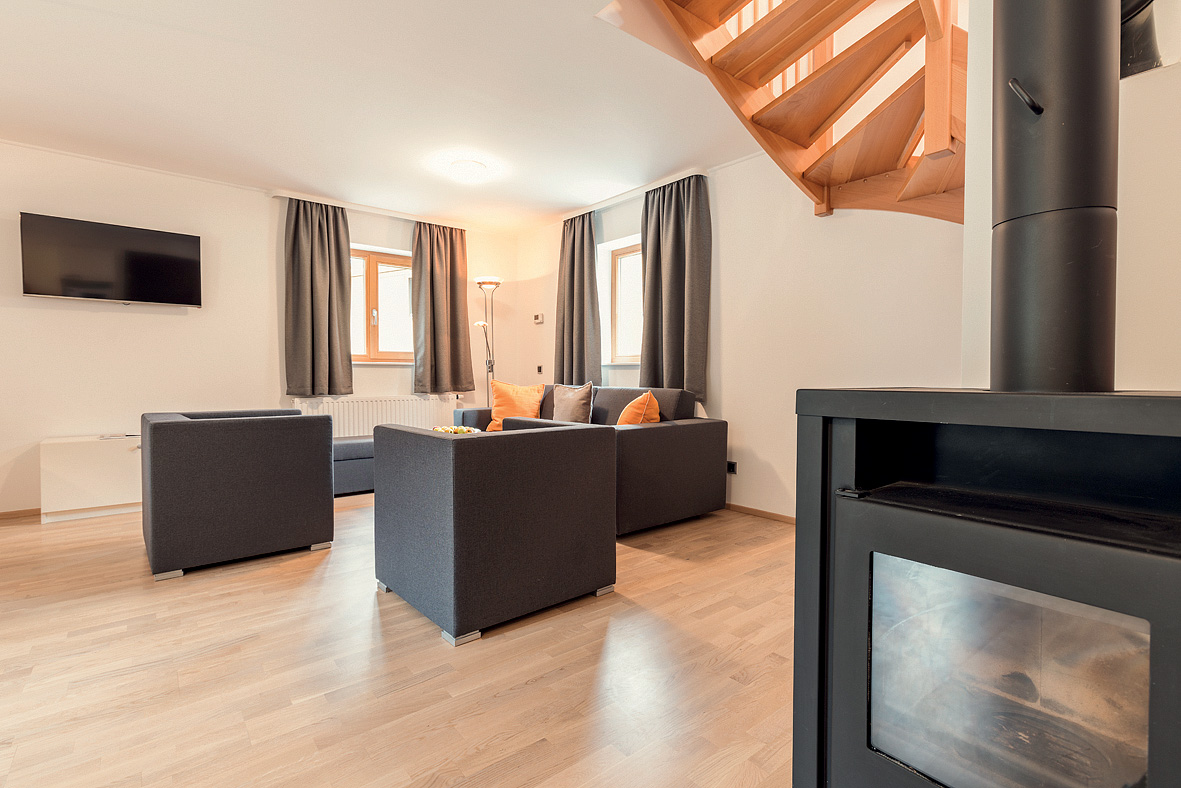88 m² - 2 ložnice s manželskou postelí, obývací pokoj s kuchyňským koutem a rozkládacím gaučem pro 2 osoby, švédská krbová kamna (palivové dřevo*), privátní sauna, 2x sociální zařízení, navíc 1x samostatné WC, terasa; všechny byty jsou vždy v přízemí