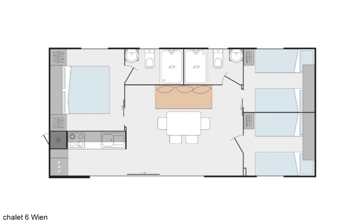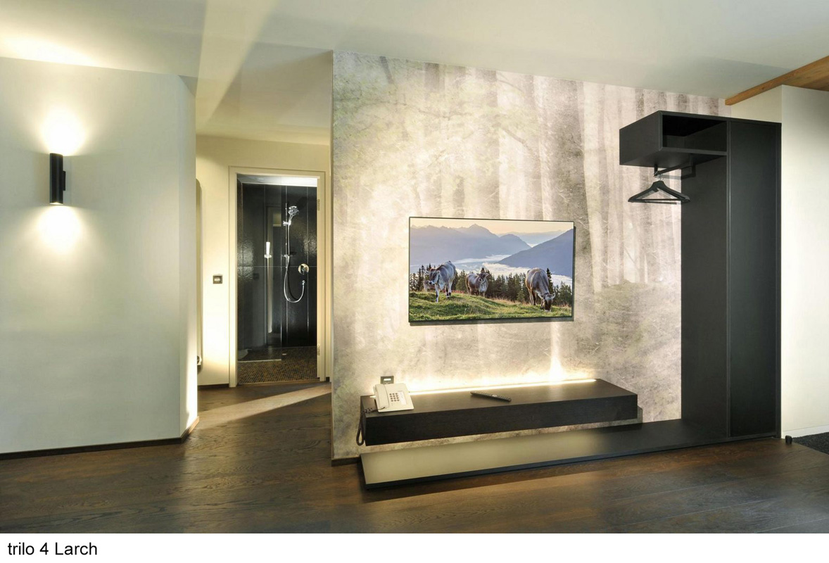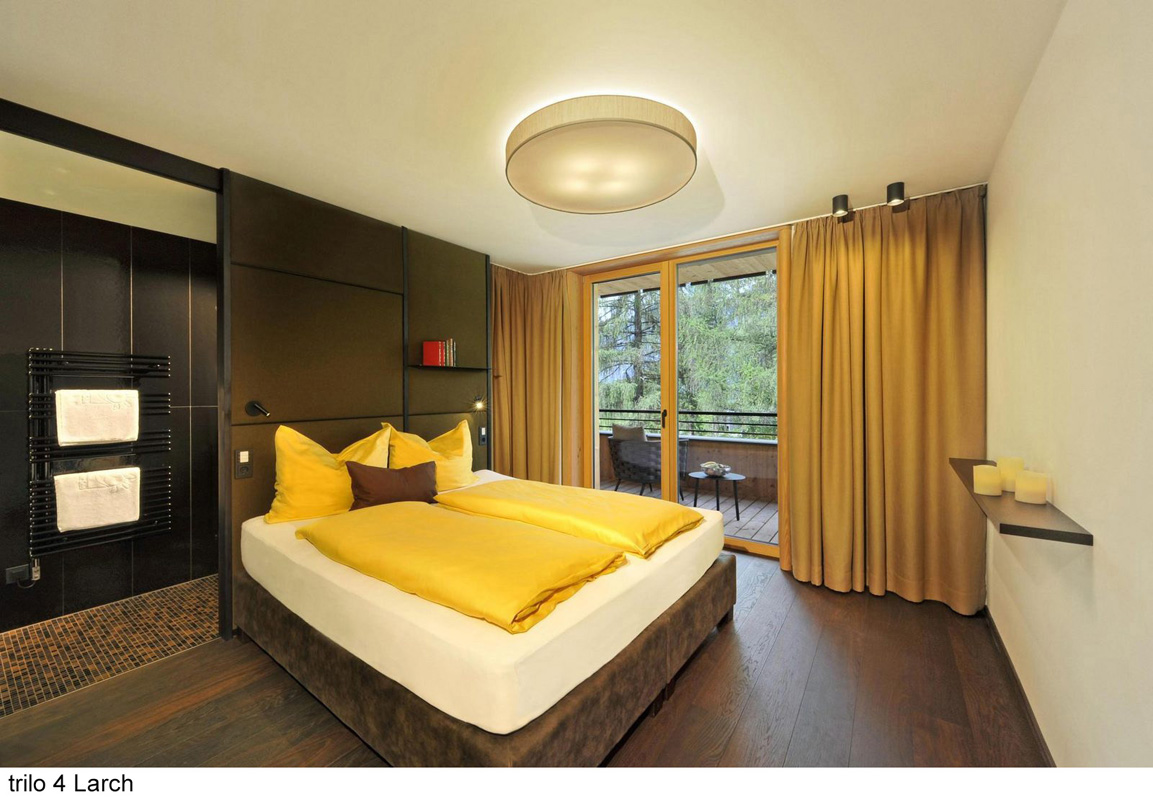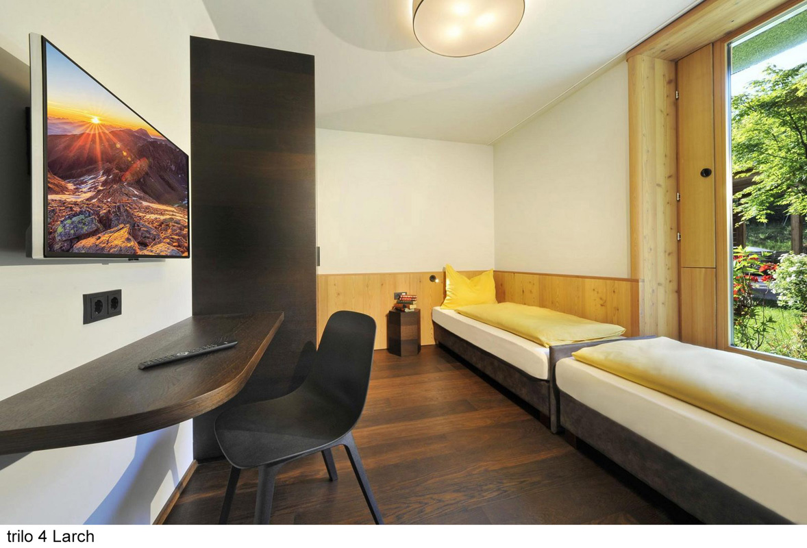 zcela jedinečný ubytovací komplex skládající se z apartmánových budov s apartmány trilo Pine a Larch, mobilehomes resp. chalety Graz a Wien a volně stojícími dřevěnými domečky Tiny home , centrální budovy s recepcí, bistrem, terasou, konferenční místností, úschovnou lyží a dětskou hernou; uvedené vzdálenosti jsou měřeny od recepce
