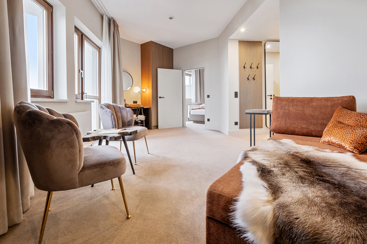38 m² - pokoj s manželskou postelí, menší pokoj se 2 samostatnými lůžky v neuzavřeném patře přístupném po schodech, obývací pokoj s rozkládacím gaučem pro 1 osobu, sociální zařízení s vanou, oddělené WC, balkon; pokoj lze obsadit nejméně 2 dospělými osobami a 2 dětmi; pokoje nedoporučujeme pro rodiny s dětmi do 4 let (kvůli schodům)