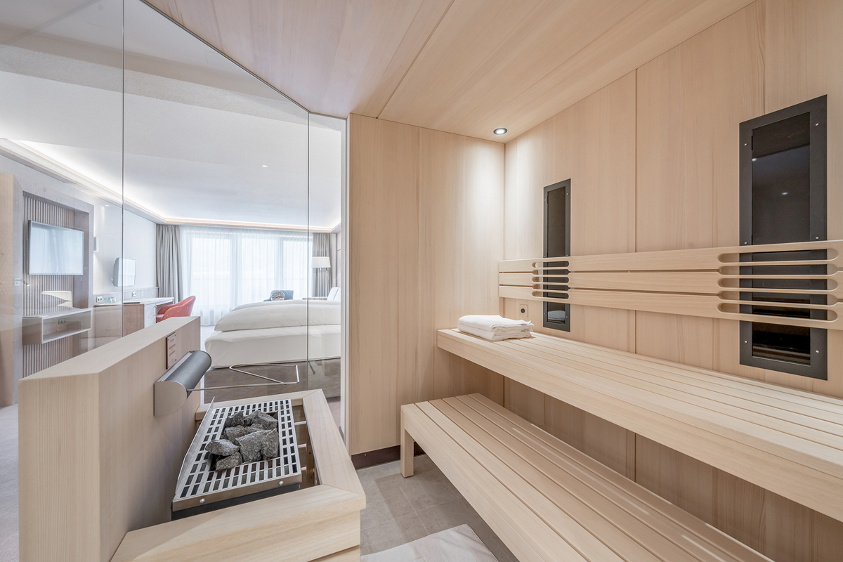 50 m² ložnice s manželskou postelí a rozkládacím gaučem pro 1 osobu, sociální zařízení s privátní saunou, oddělené WC, balkon