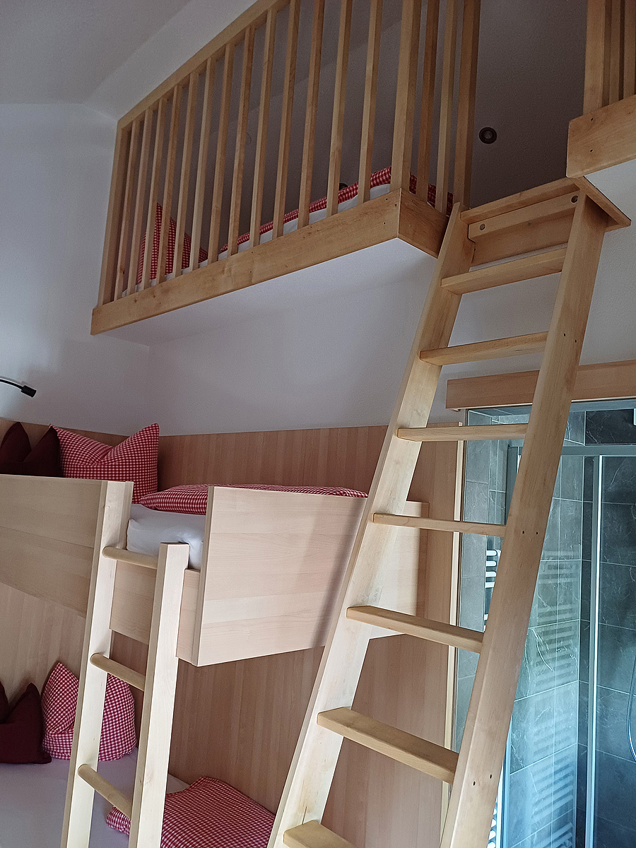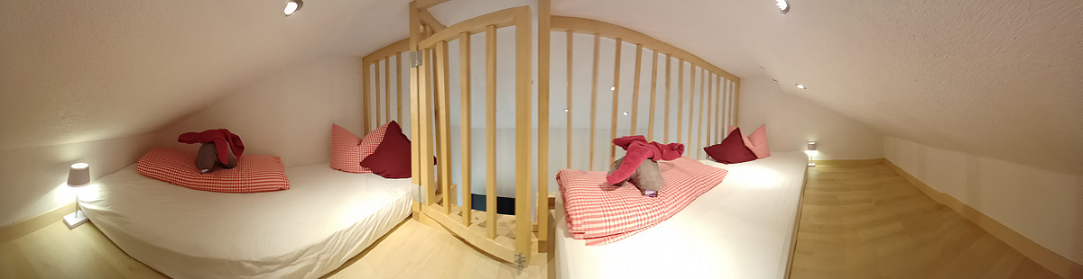 80 m² - 1 ložnice s manželskou postelí, ložnice s palandou a neuzavřeným patrem (přístup po posuvných schodech) se 2 přistýlkami pro 2 děti do nedovršených 13 let, samostatná kuchyň, 2x sociální zařízení; byt se nachází v podkroví domu