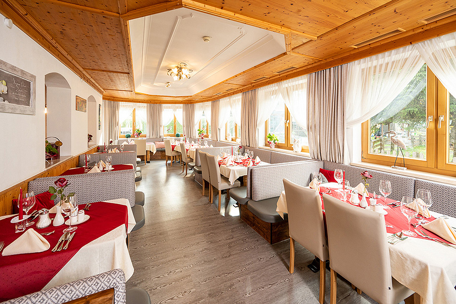 večeře - servírované menu s výběrem z 3 hlavních jídel s přílohou, servírovaný studený předkrm, servírovaná polévka, salátový bufet, servírovaný dezert, nápoje za poplatek; několikrát týdně večeře formou tématického bufetu