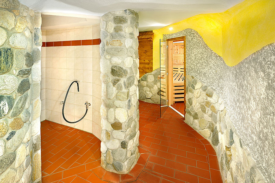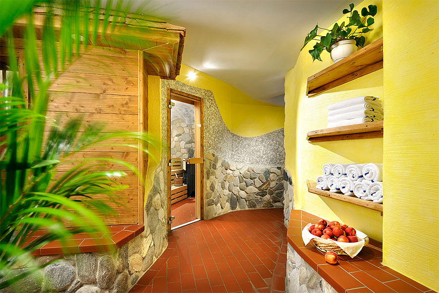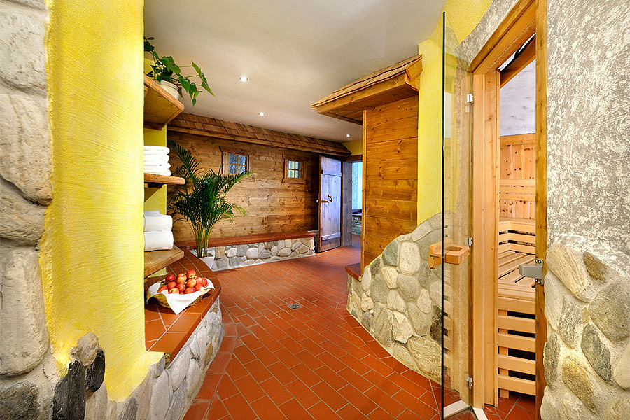 vnitřní a venkovní bazén 72 m² s umělým vodopádem, venkovní dětský bazének, finská sauna, pára, infrakabina, horizontální solárium*, relaxační koutek s lehátky, masáže*
