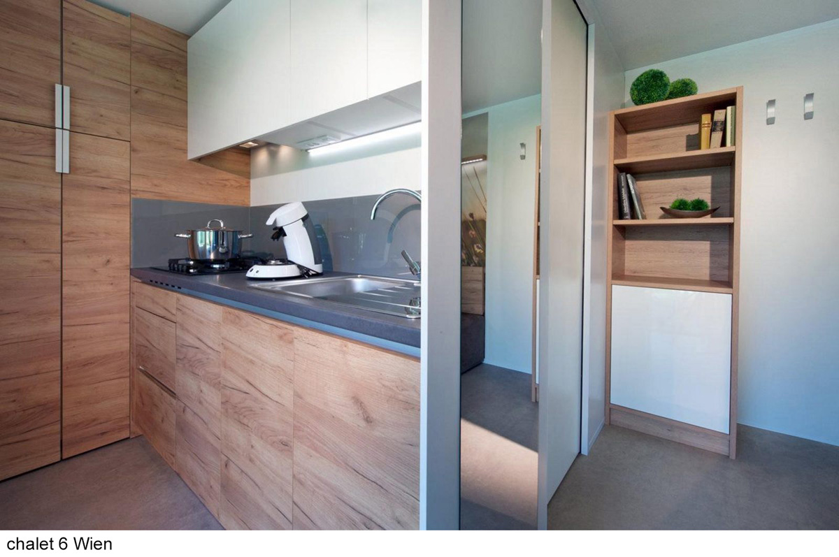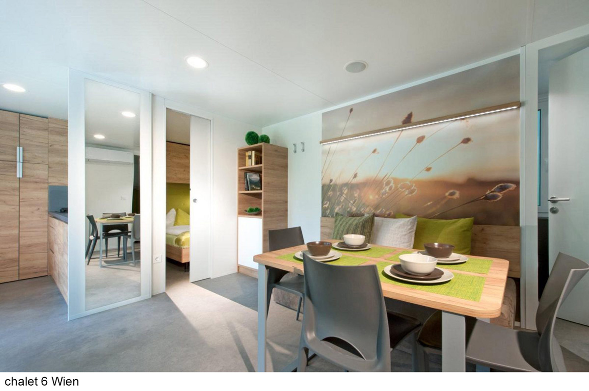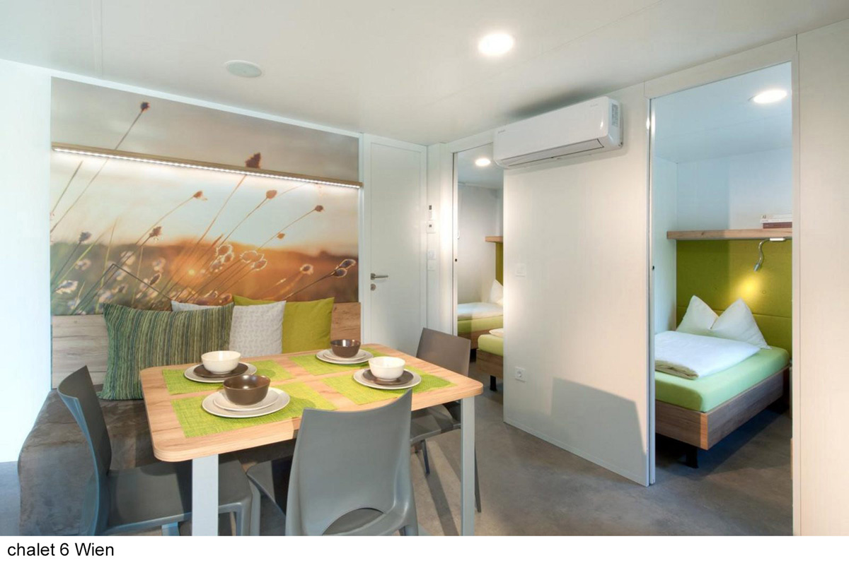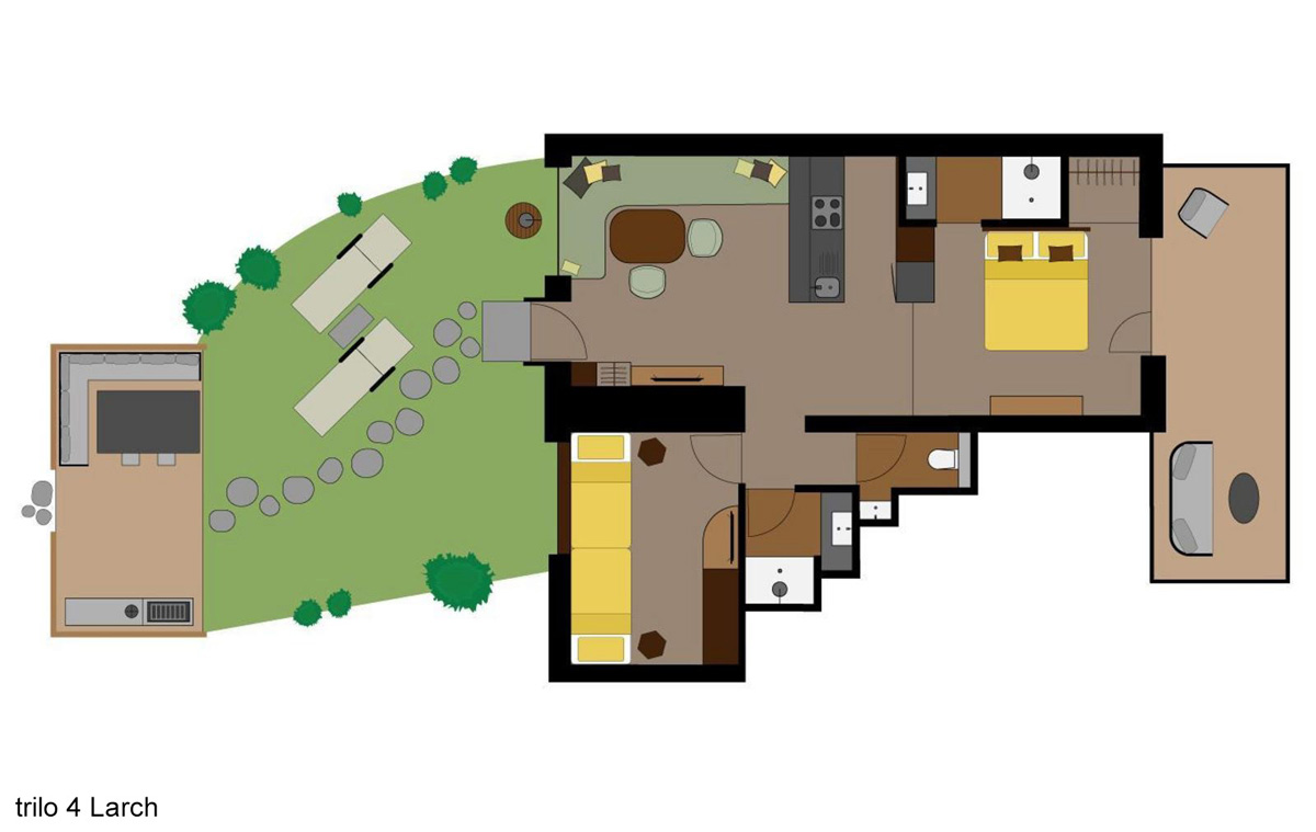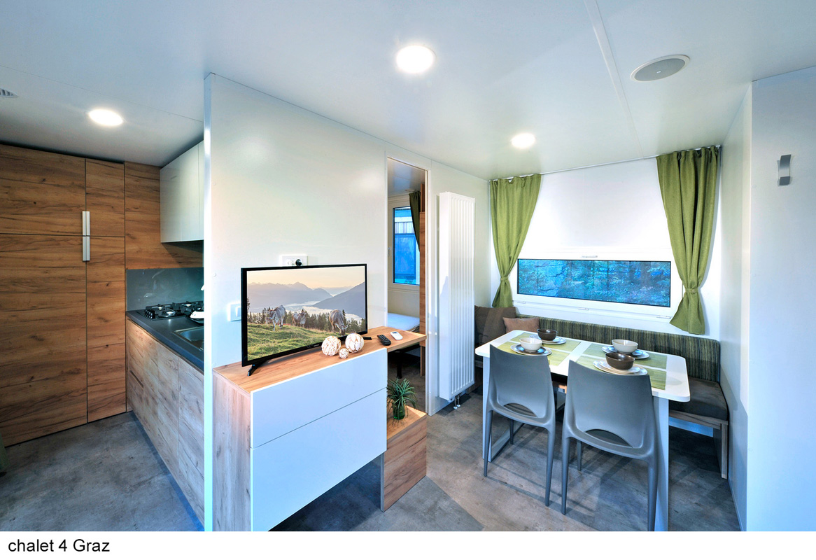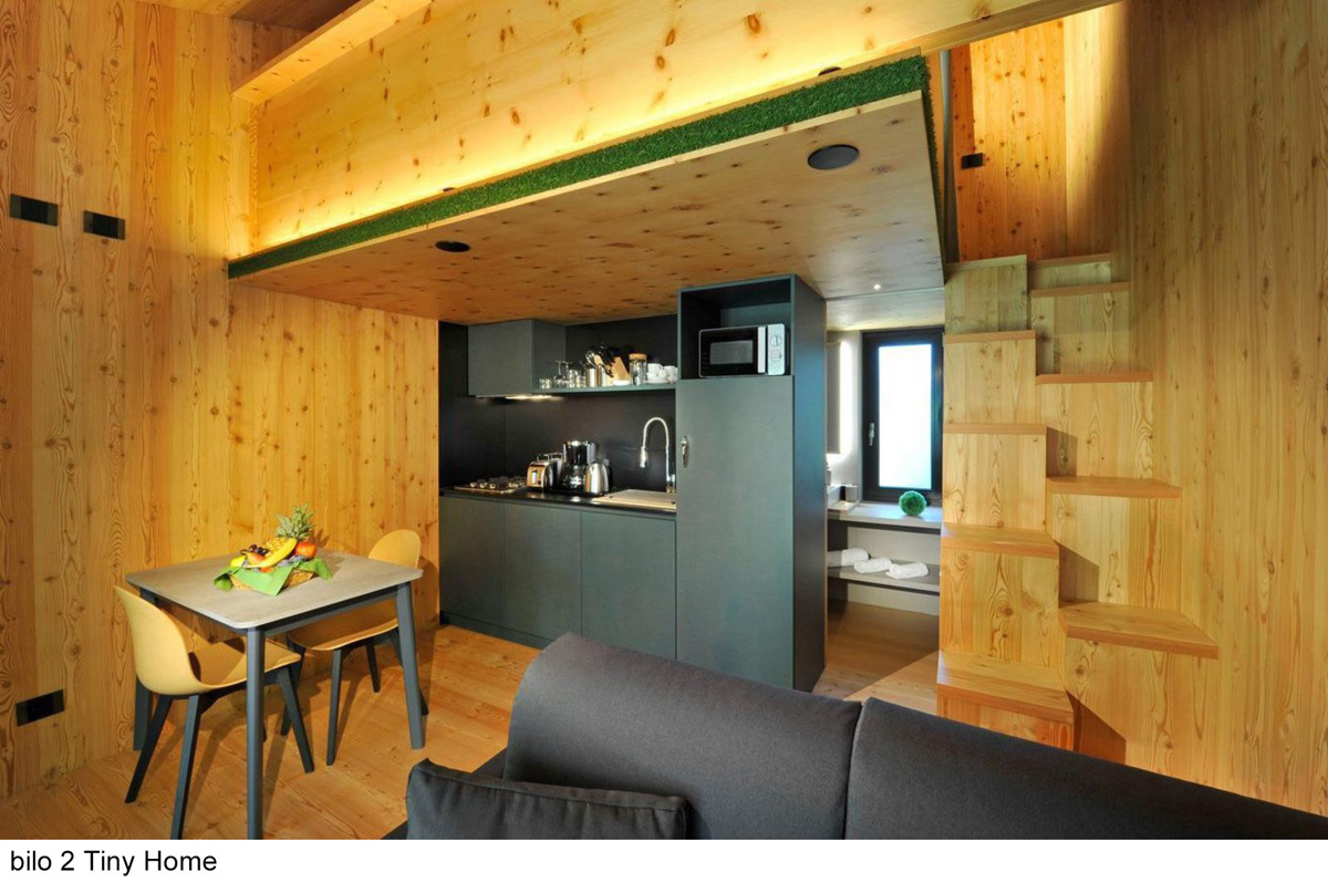 zcela jedinečný ubytovací komplex skládající se z apartmánových budov s apartmány trilo Pine a Larch, mobilehomes resp. chalety Graz a Wien a volně stojícími dřevěnými domečky Tiny home, centrální budovy s recepcí, bistrem, terasou, konferenční místností, úschovnou lyží a dětskou hernou; uvedené vzdálenosti jsou měřeny od recepce