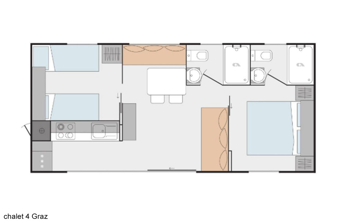 40 m² - 1 ložnice s manželskou postelí, 2 ložnice se 2 samostatnými lůžky každá, obývací pokoj s gaučem a kuchyňským koutem, 2x sociální zařízení, terasa, privátní parkovací stání (1 místo / apartmán)