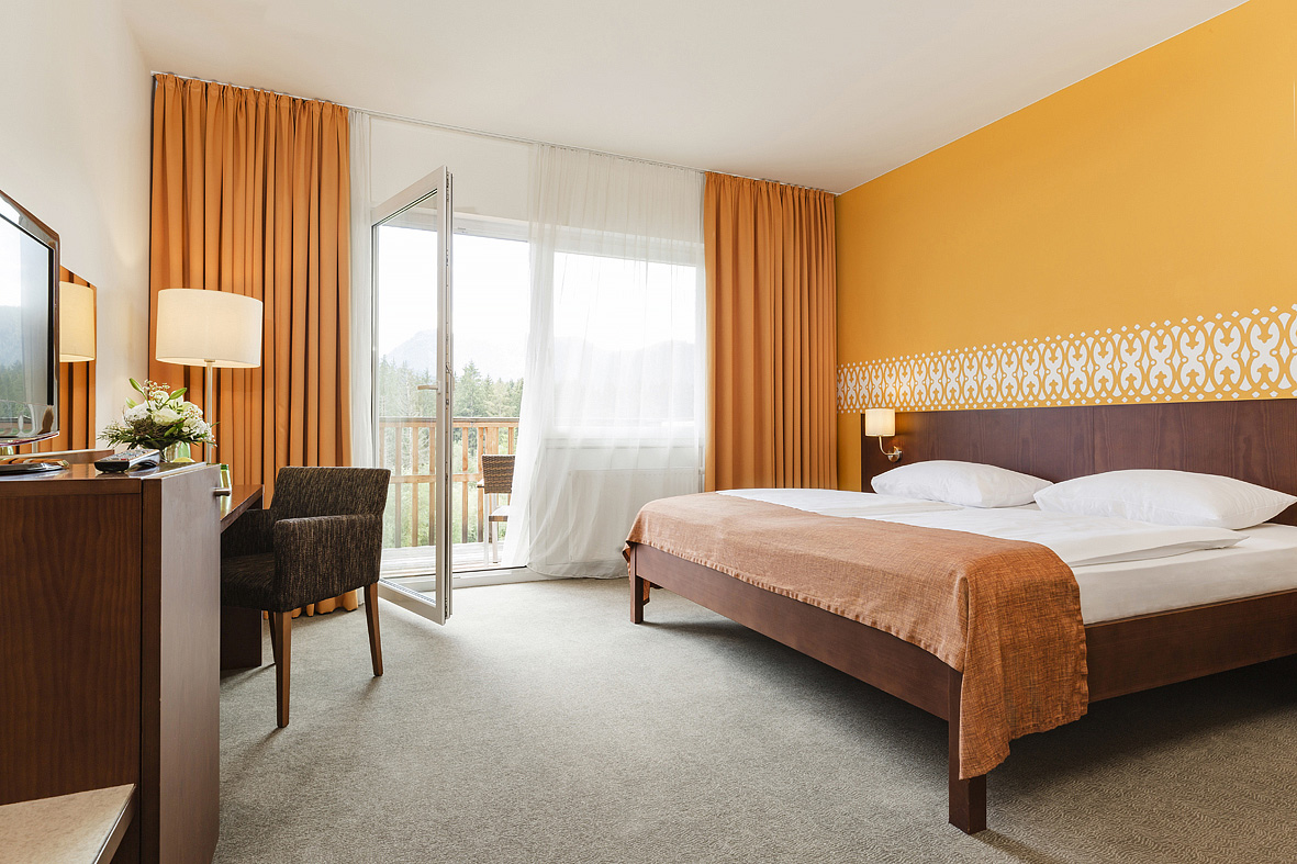 28 m² - pokoj s manželskou postelí a rozkládacím gaučem pro 1 dítě do nedovršených 18 let, sociální zařízení, zpravidla balkon s výhledem na Grimming