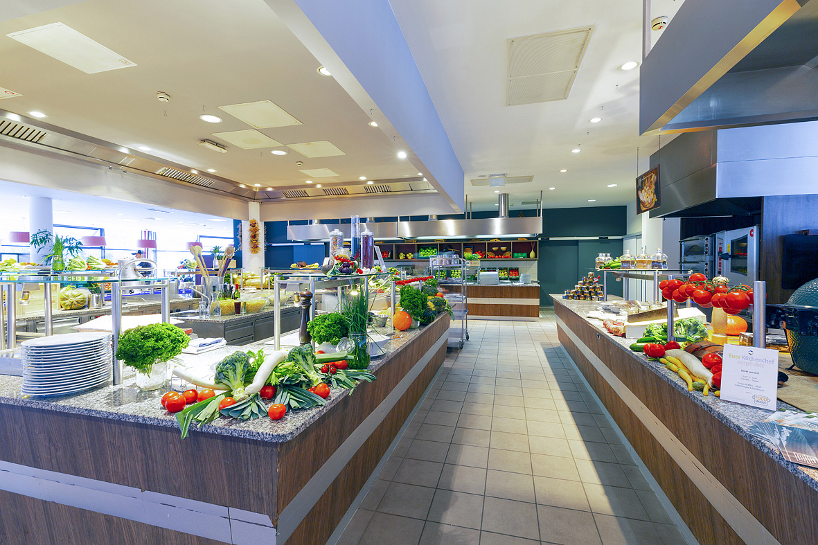formou bohatého tematického bufetu studených a teplých předkrmů, polévek, hlavních jídel, příloh, salátů, sýrů, dezertů a zmrzliny; v době večeře též vybrané nealkoholické nápoje, točené pivo a lahvové víno, ostatní nápoje za poplatek; zpravidla pizza koutek a 1x menu v rámci show cooking