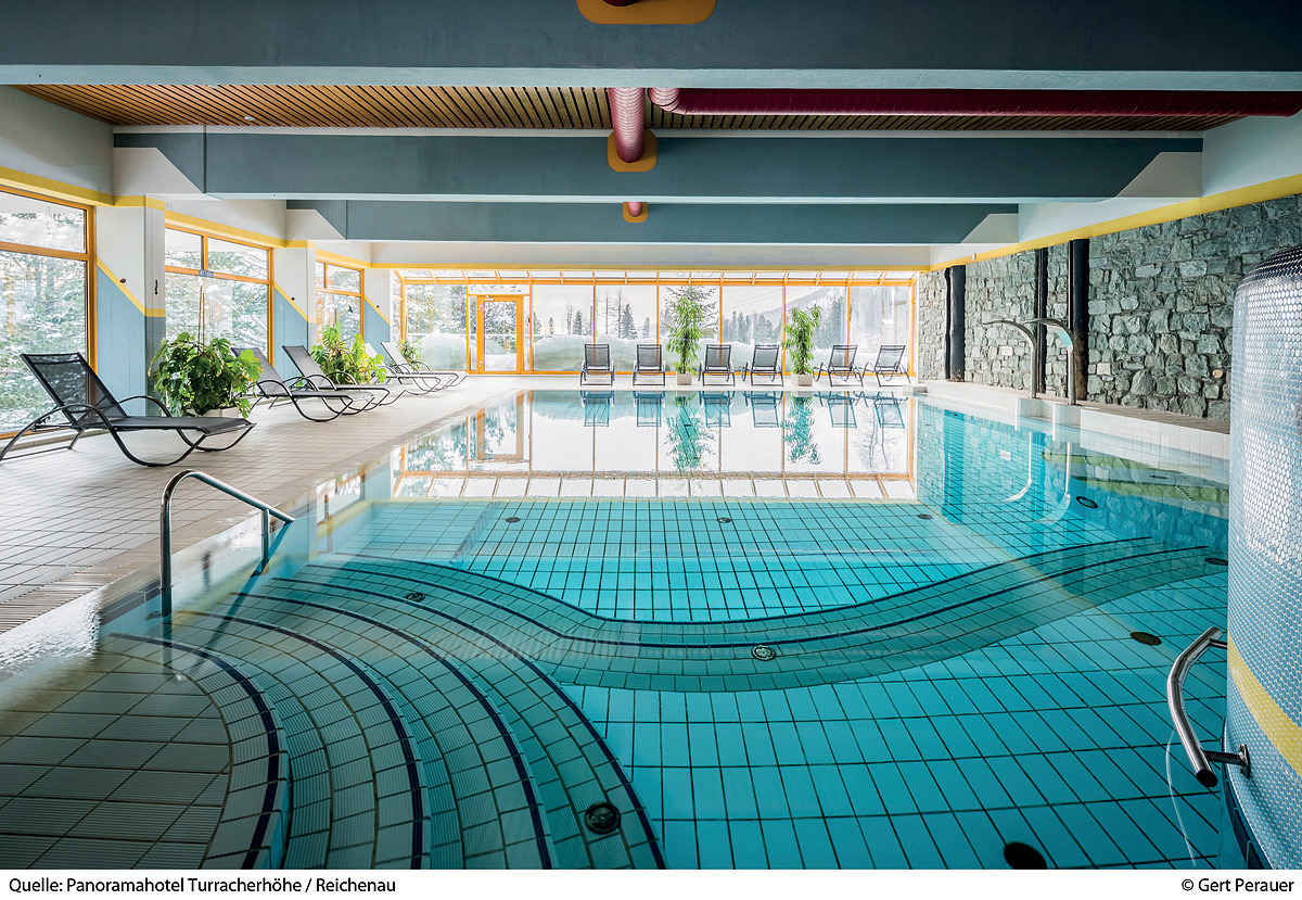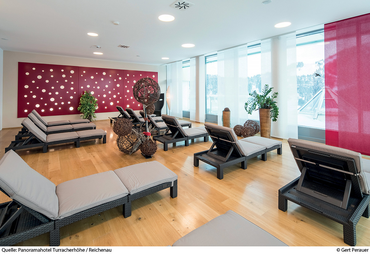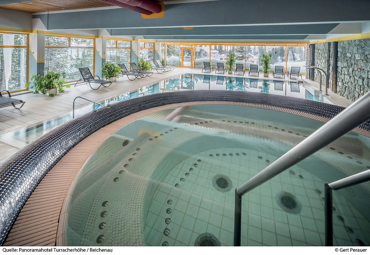bazén 5 x 12 m, vířivka, finská sauna, bylinná sauna, pára, relaxační koutek s lehátky, terasa s panoramatickým výhledem, masáže*, kosmetické služby*, posilovna, biliár*, stolní fotbal*, stolní tenis*