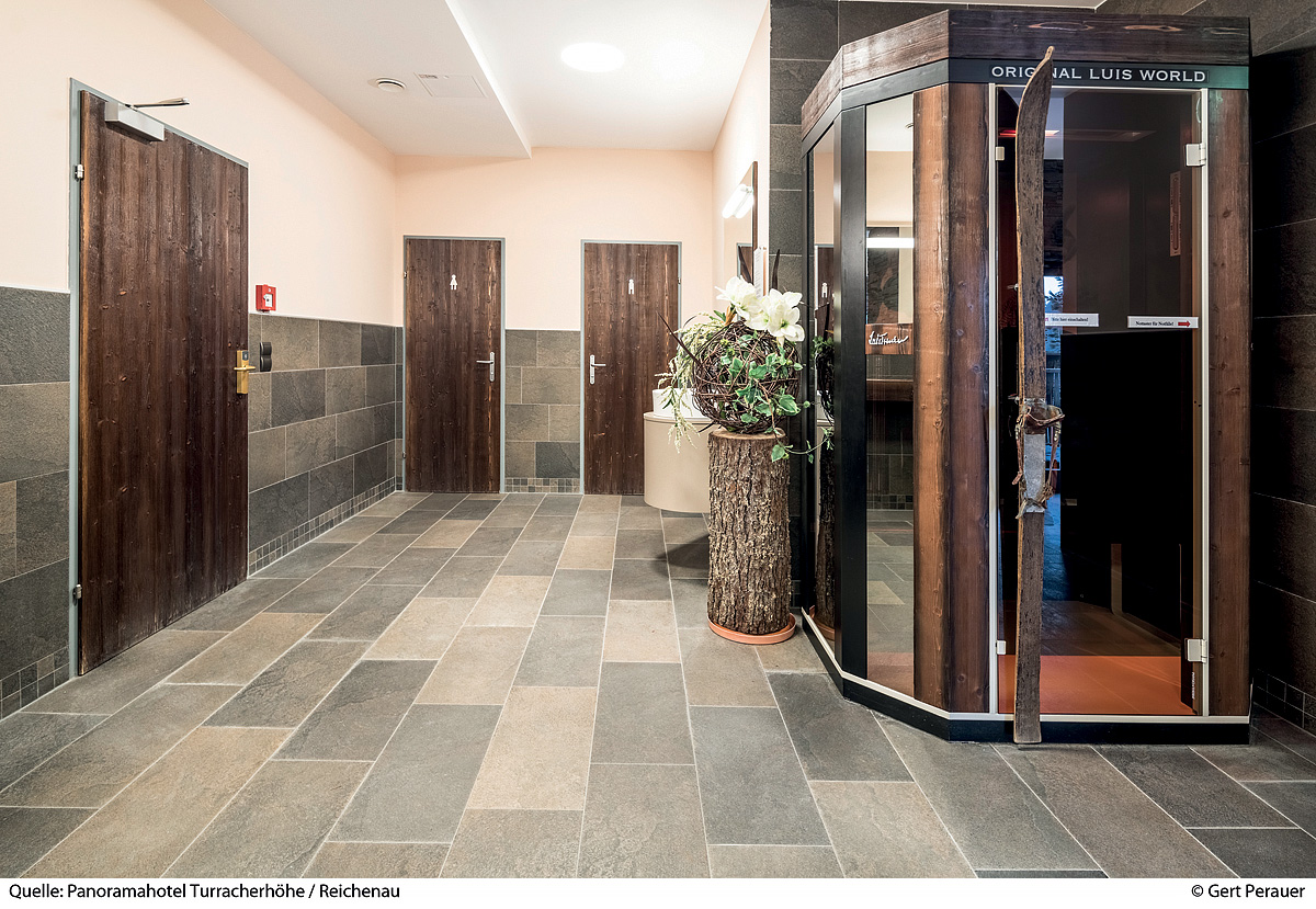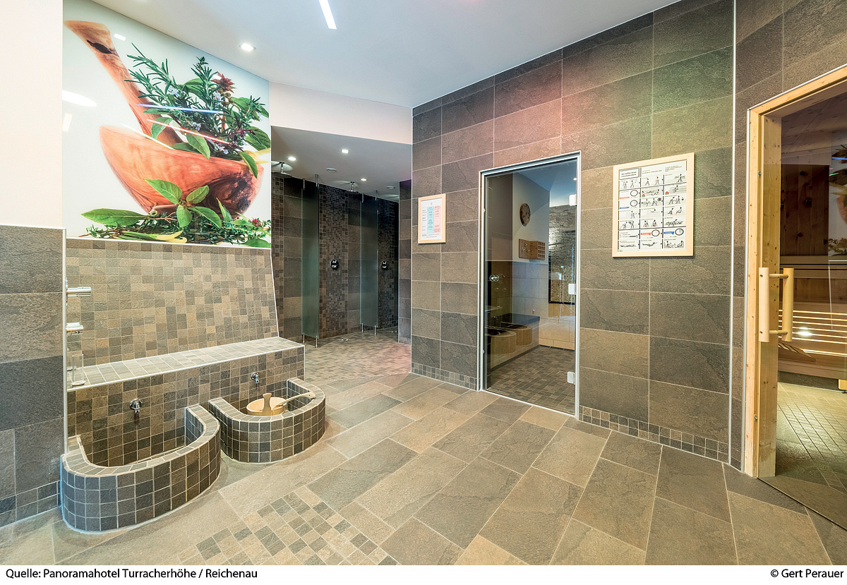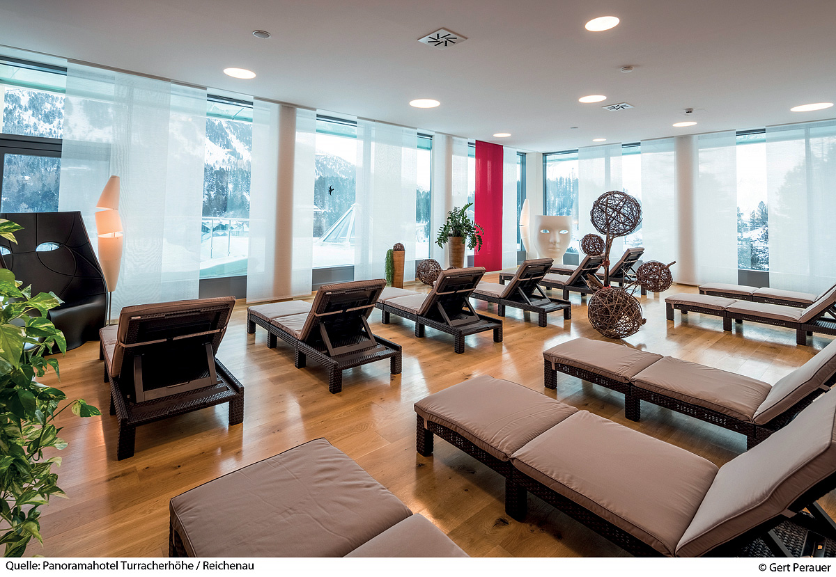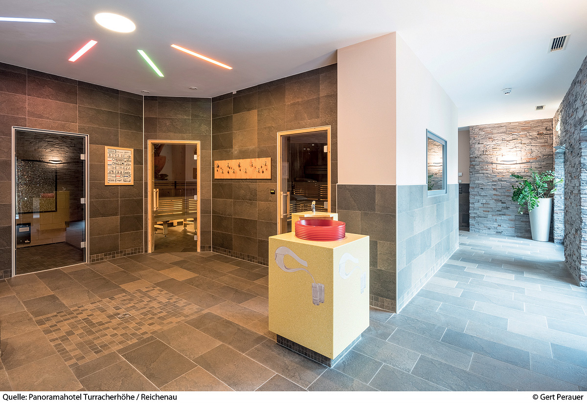 bazén 5 x 12 m, vířivka, finská sauna, bylinná sauna, pára, relaxační koutek s lehátky, terasa s panoramatickým výhledem, masáže*, kosmetické služby*, posilovna, biliár*, stolní fotbal*, stolní tenis*