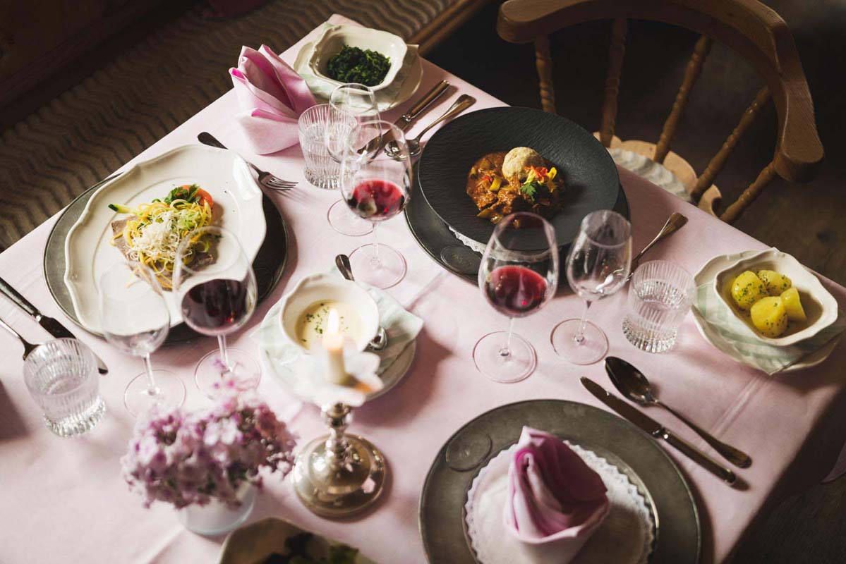 večeře - servírované 5chodové menu s výběrem hlavního jídla s přílohou, předkrmy, saláty, sýry a dezerty formou bufetu, nápoje za poplatek