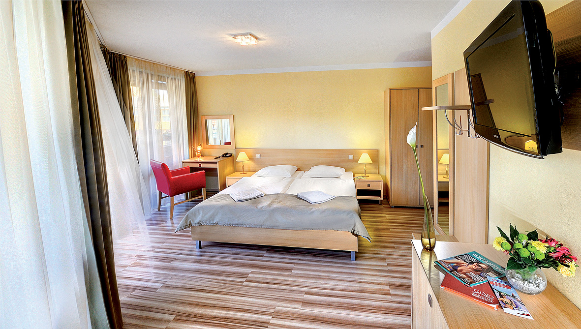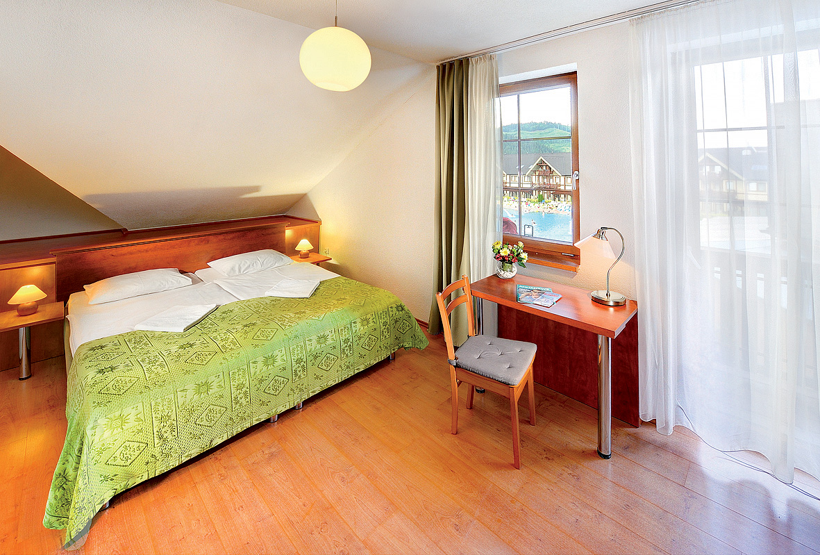pokoj s manželskou postelí s oddělitelnými lůžky a rozkládacím křeslem na lůžko pro 1 dítě do nedovršených 12 let, sociální zařízení; některé pokoje jsou situovány v podkroví, bez balkonu