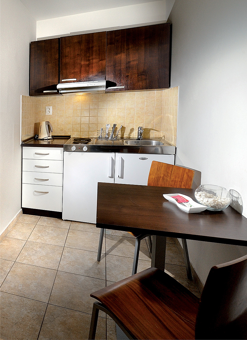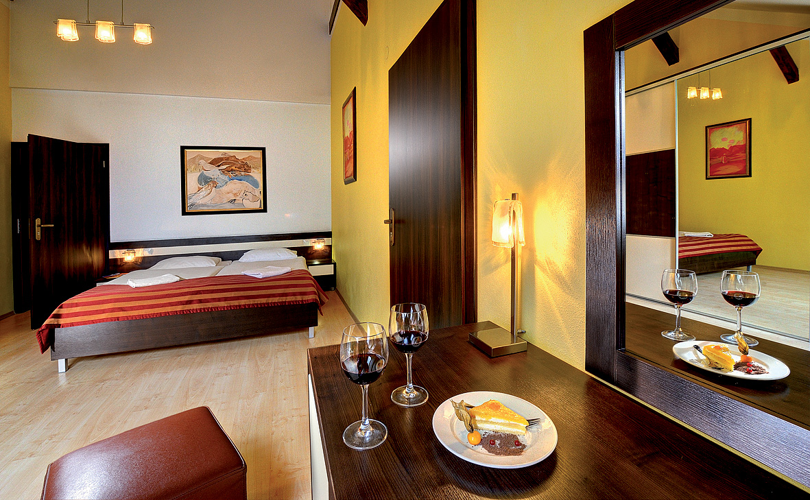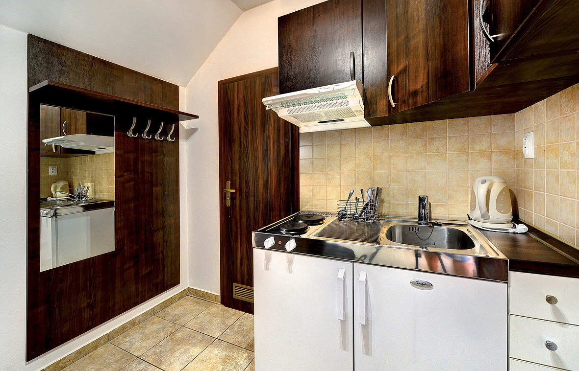 pokoj s malým kuchyňským koutem a manželskou postelí, sociální zařízení; některá studia jsou situována v podkroví; možnost 2 přistýlek formou rozkládacího gauče